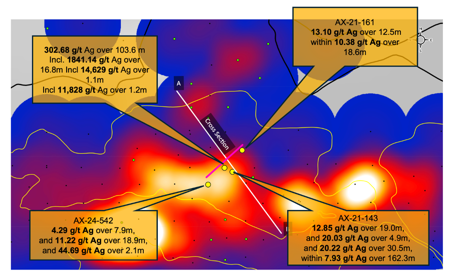 With Banyan’s re-interpretation of regional structural controls and 2021 drillholes intersecting highgrade Keno-style silver mineralization, Banyan believes that 2025 drilling will confirm a potentially significant structurally controlled silver system that is similar in style to the well-known neighbouring Keno Hill district. Drilling has intersected exceptionally high-grade silver over meaningful widths. Highlights from the 2021 program at hole AX-21-142 – 1841.14 g/t silver (“Ag”) over 16.8 metres within 302.68 g/t Ag over 103.6 m and included 14,629 g/t Ag over 1.1m and 11,828 g/t Ag over 1.2m (Figure 3).