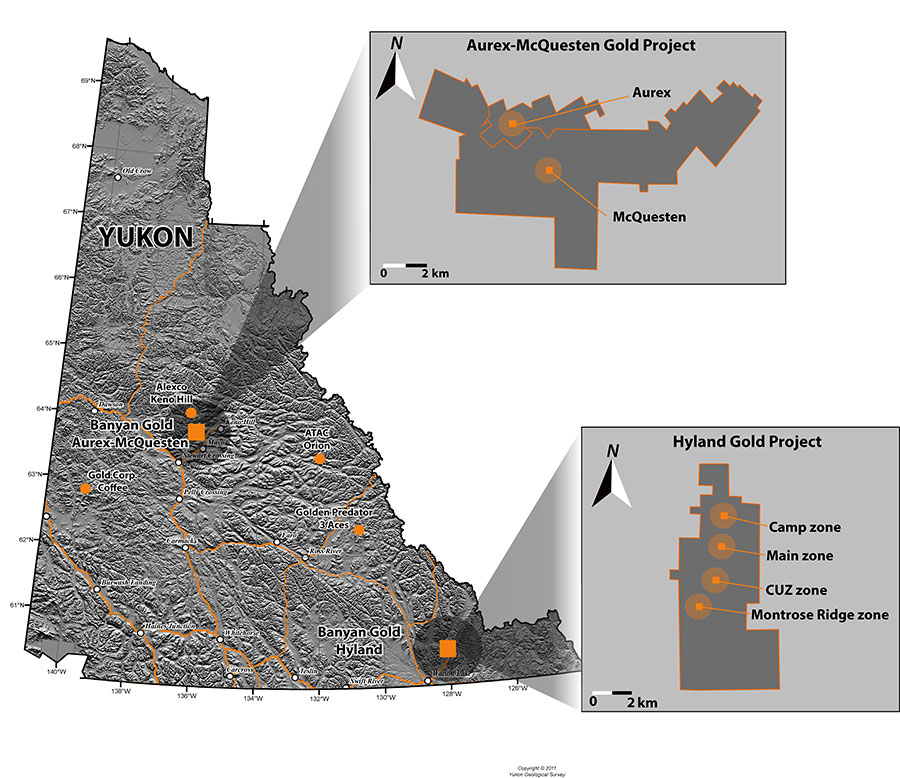 The AurMac Gold Project (the “Project” or the “Property”) is located in the Mayo Mining district, approximately 40 kilometres (“km”) northeast from the village of Mayo and 356 km north of Whitehorse, within the traditional territory of the First Nation of Na-Cho Nyak Dun. The AurMac Gold Project consists of the Aurex and McQuesten projects optioned from Victoria Gold Corp. and Hecla Mining Company, respectively, as well as additional claims staked by Banyan Gold Corp. (the “Company” or “Banyan”). With the optioned claim blocks and additional staking completed by Banyan, the AurMac Property currently covers over 291 km2. Banyan has earned 100% of the Aurex and McQuesten Properties subject to royalties (refer to news release dated September 18, 2025). The projects are road accessible through the Silver Trail highway and a network of four-wheel drive roads and trails.
