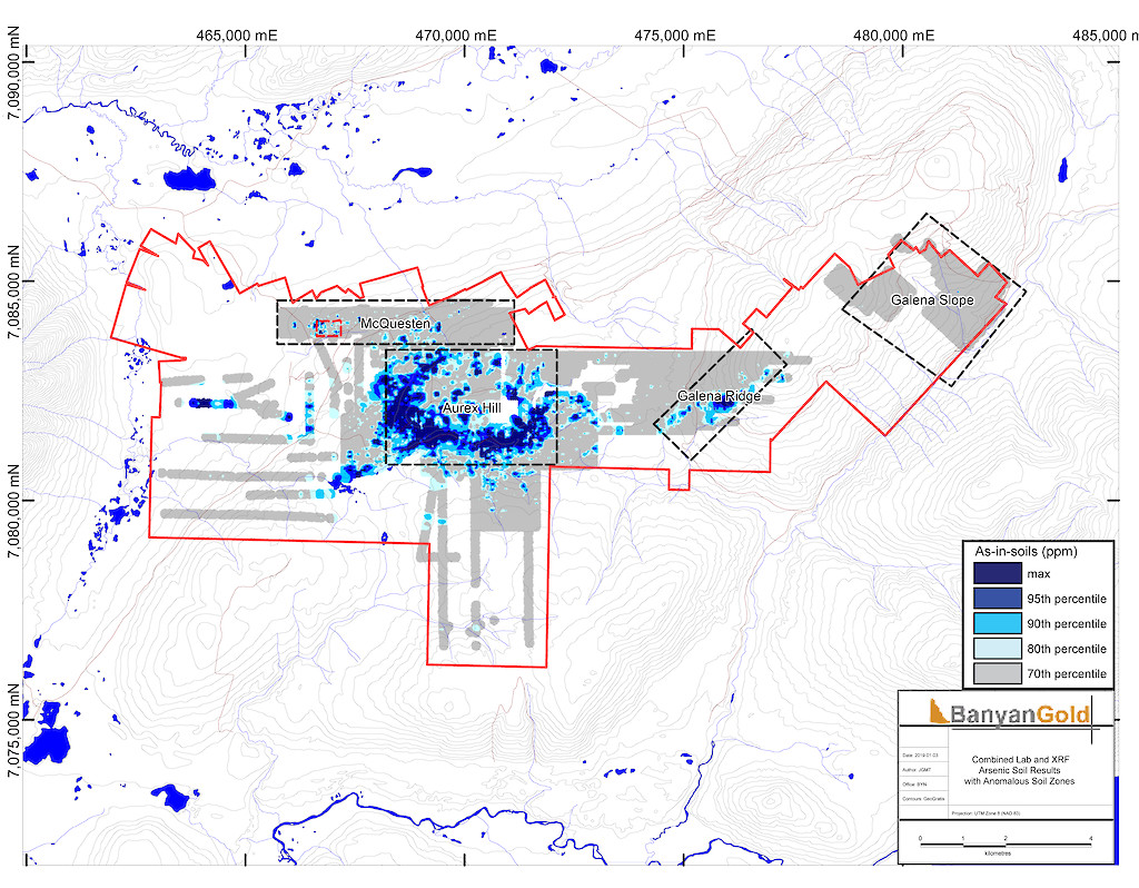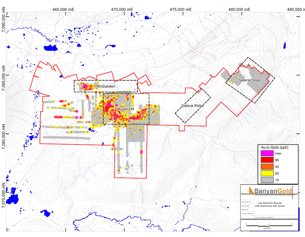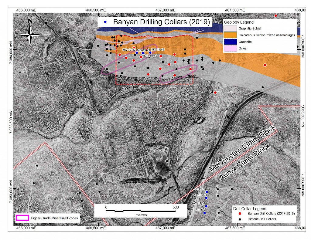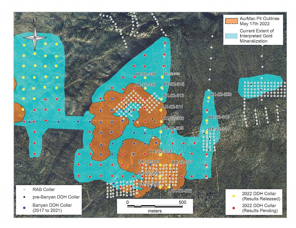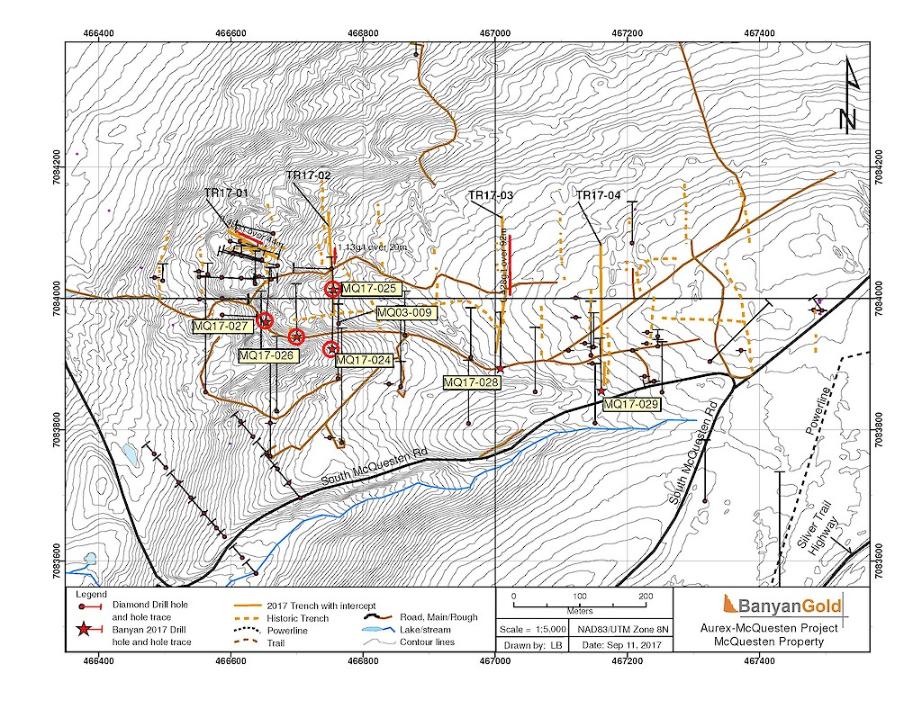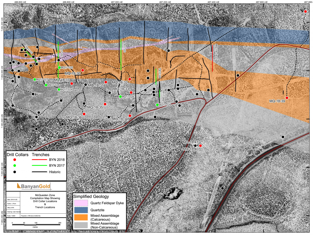 In 2017, Banyan carried out its inaugural exploration program on the consolidated AurMac Property. On the McQuesten Claim Block 317 soil samples were collected to expand on the surface geochemical dataset, five (5) additional trenches totalling 342 metres (“m”) tested historic trenching data and Au-in-soil anomalies, six diamond drillholes (913 m) targeting mineralization through the Airstrip Zone, and 181 line-kilometres of airborne radiometric and magnetic surveying was completed. Work was also completed on the Aurex Hill Zone consisting of 695 soil samples, highlighting a positive Au-Bi correlation, and four diamond drillholes (509 m) targeted anomalous intercepts form 1994 and 1995 rotary air-blast drilling.