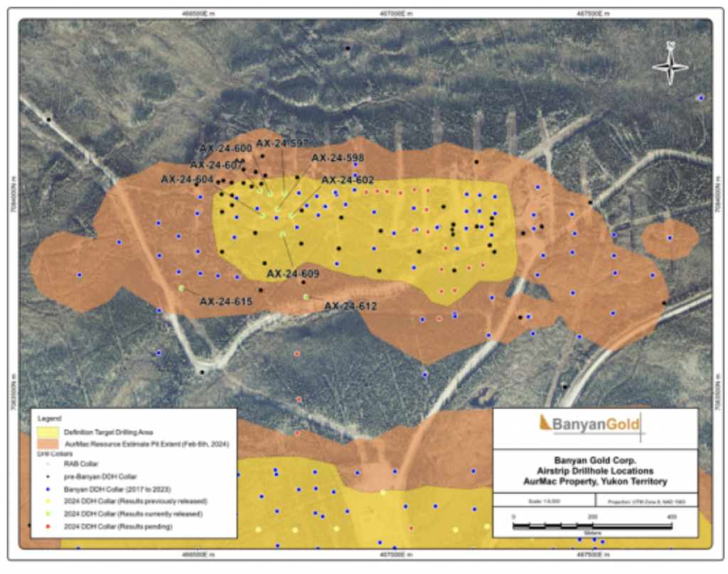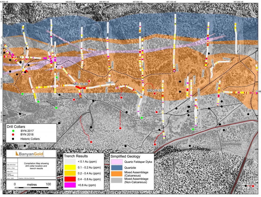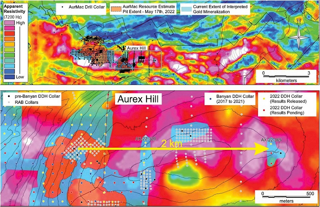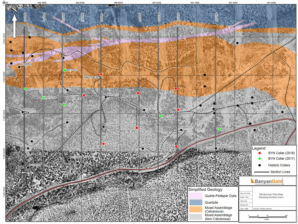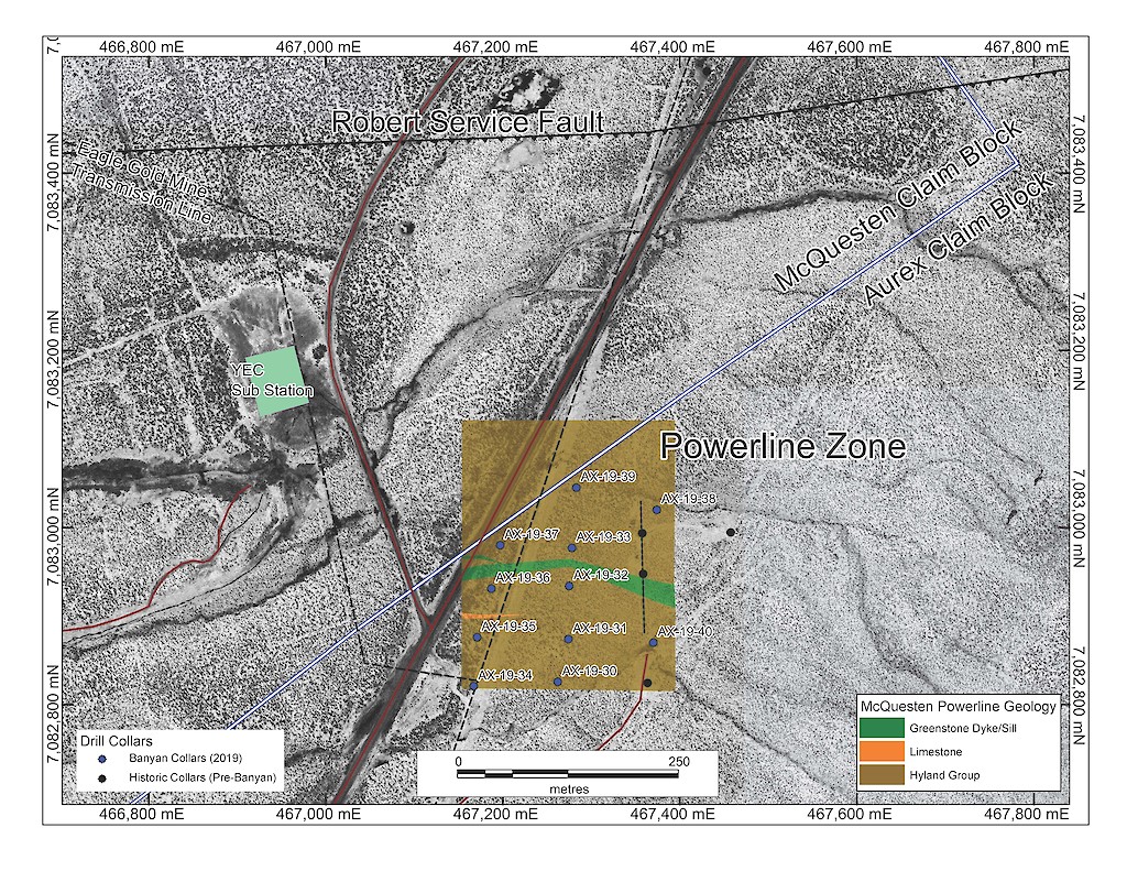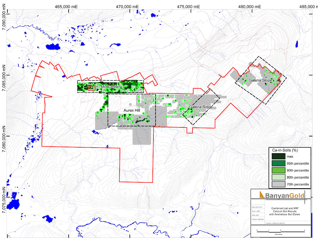 In 2017, Banyan carried out its inaugural exploration program on the consolidated AurMac Property. On the McQuesten Claim Block 317 soil samples were collected to expand on the surface geochemical dataset, five (5) additional trenches totalling 342 metres (“m”) tested historic trenching data and Au-in-soil anomalies, six diamond drillholes (913 m) targeting mineralization through the Airstrip Zone, and 181 line-kilometres of airborne radiometric and magnetic surveying was completed. Work was also completed on the Aurex Hill Zone consisting of 695 soil samples, highlighting a positive Au-Bi correlation, and four diamond drillholes (509 m) targeted anomalous intercepts form 1994 and 1995 rotary air-blast drilling.