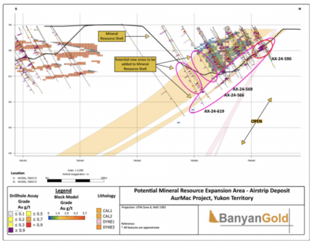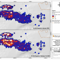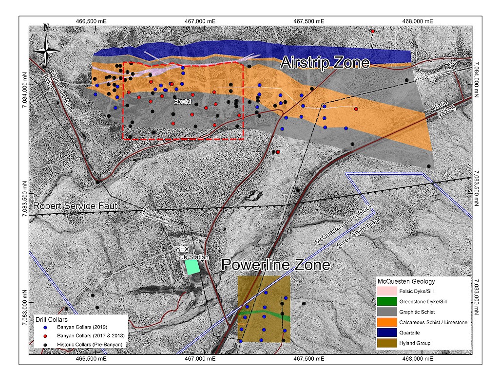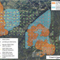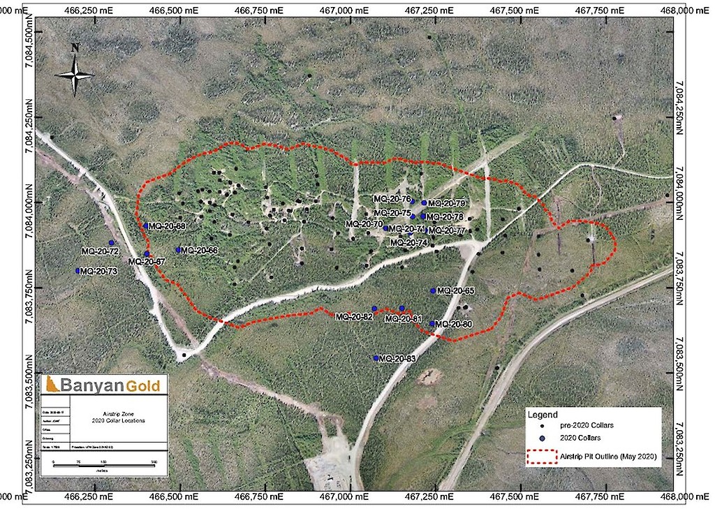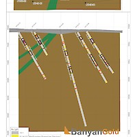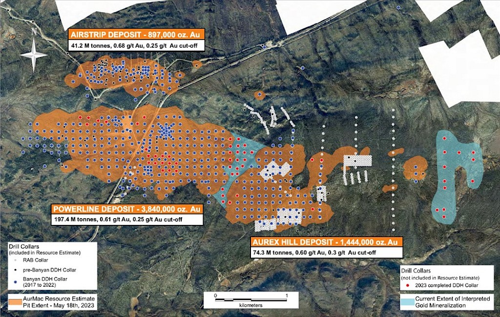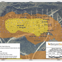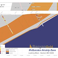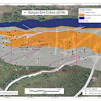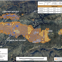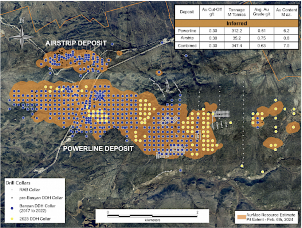 In 2020, Banyan released an initial inferred mineral resource for the Airstrip Deposit, based on work completed from 2017-2019, and also the Powerline Zone, based on drilling completed in 2019. These new inferred resources for the Airstrip and Powerline Zones totalled 775 koz Au with an average grade of 0.52 g/t at a 0.2 g/t Au cut-off in the and 129 koz Au with and average grade of 0.61 g/t Au at a 0.2 g/t cut-off respectively.