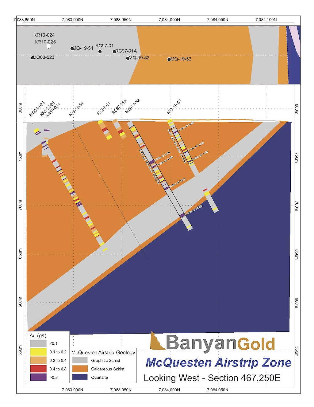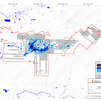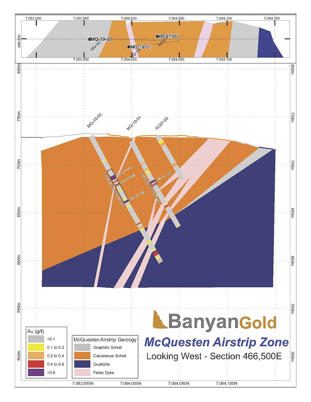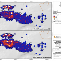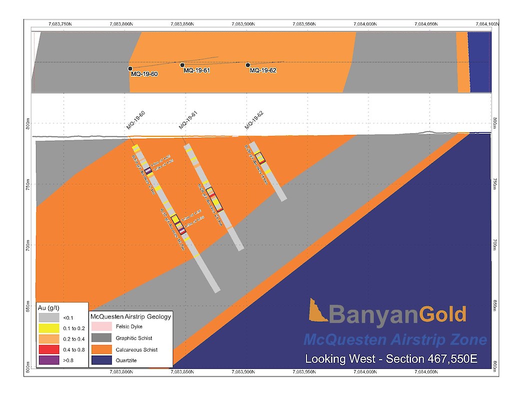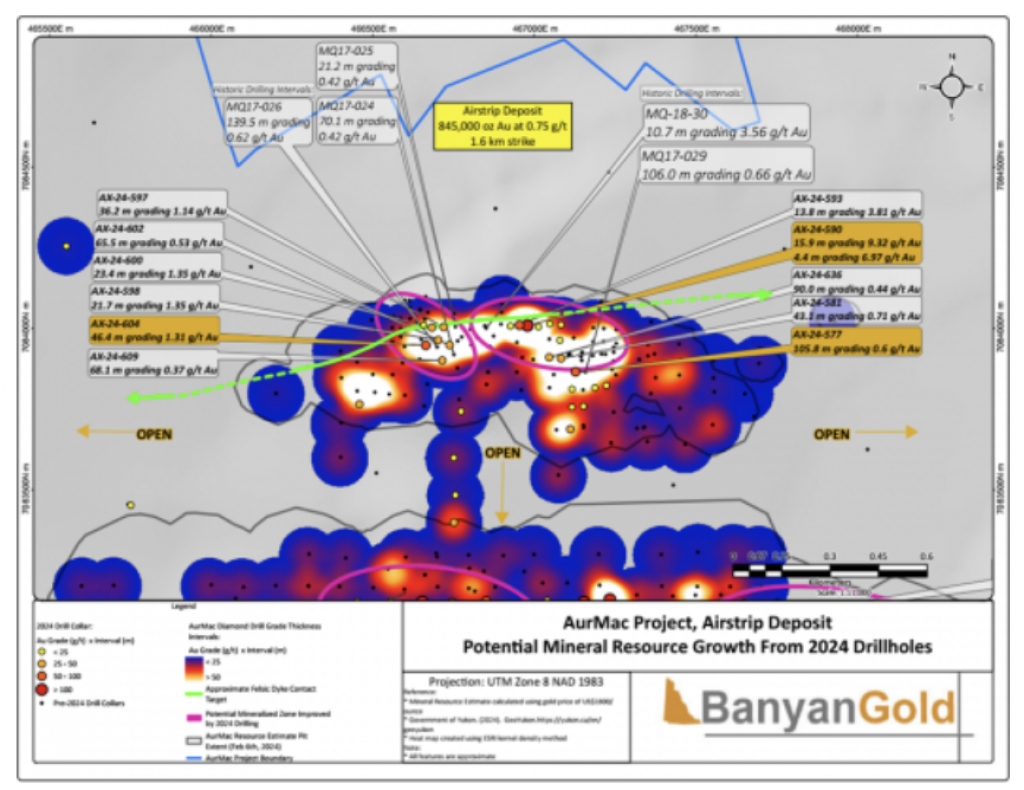 In 2020, Banyan released an initial inferred mineral resource for the Airstrip Deposit, based on work completed from 2017-2019, and also the Powerline Zone, based on drilling completed in 2019. These new inferred resources for the Airstrip and Powerline Zones totalled 775 koz Au with an average grade of 0.52 g/t at a 0.2 g/t Au cut-off in the and 129 koz Au with and average grade of 0.61 g/t Au at a 0.2 g/t cut-off respectively.