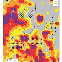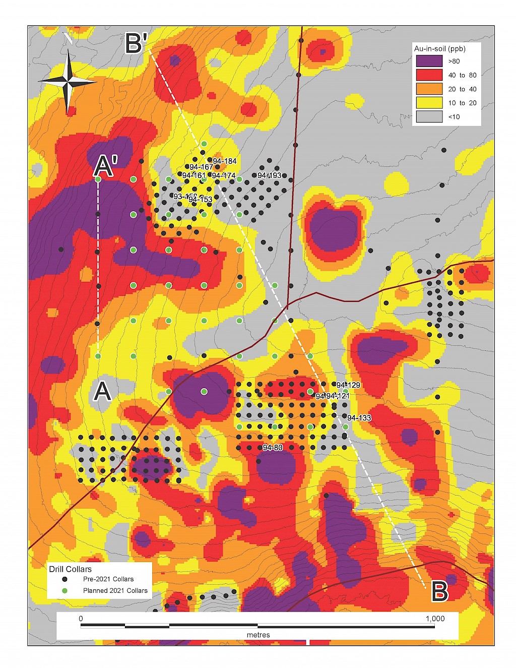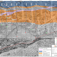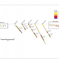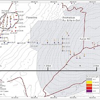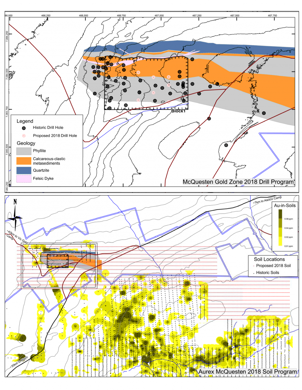 In 2018, further surface geochemical data collection and trenching was completed in the McQuesten Claim Block to fill in gaps in historic datasets, as well as to expand the Airstrip Zone footprint including 1,310 soil samples and a single 108 m trench. An additional twelve diamond drillholes totalling 1,414 m were drilled to complete infill drilling within 2017 drilling, investigate underlying stratigraphy, and extend the Airstrip Zone on-strike to the east. Soil sampling was also carried out on the Aurex Claim block in 2018 consisting of 2,388 samples to expand the Aurex Hill Zone and identify new targets on the Property.