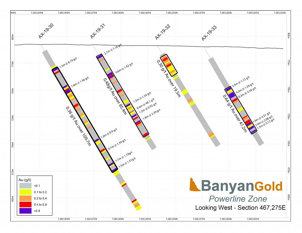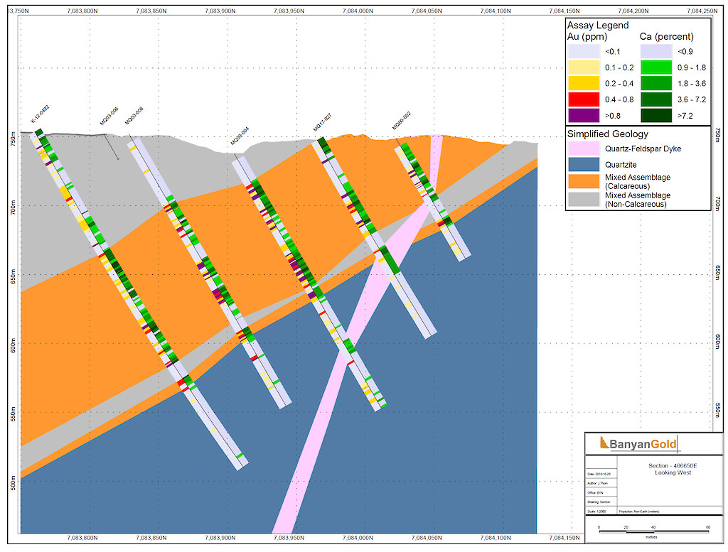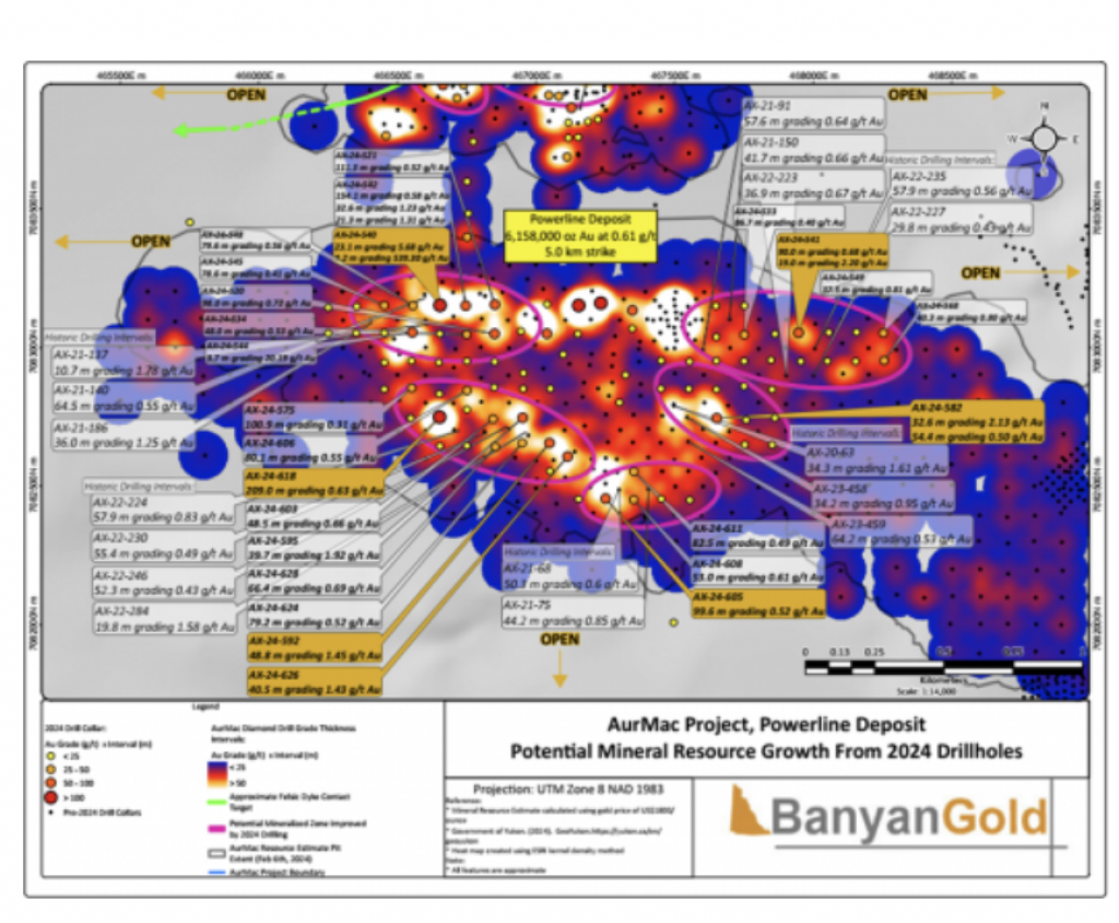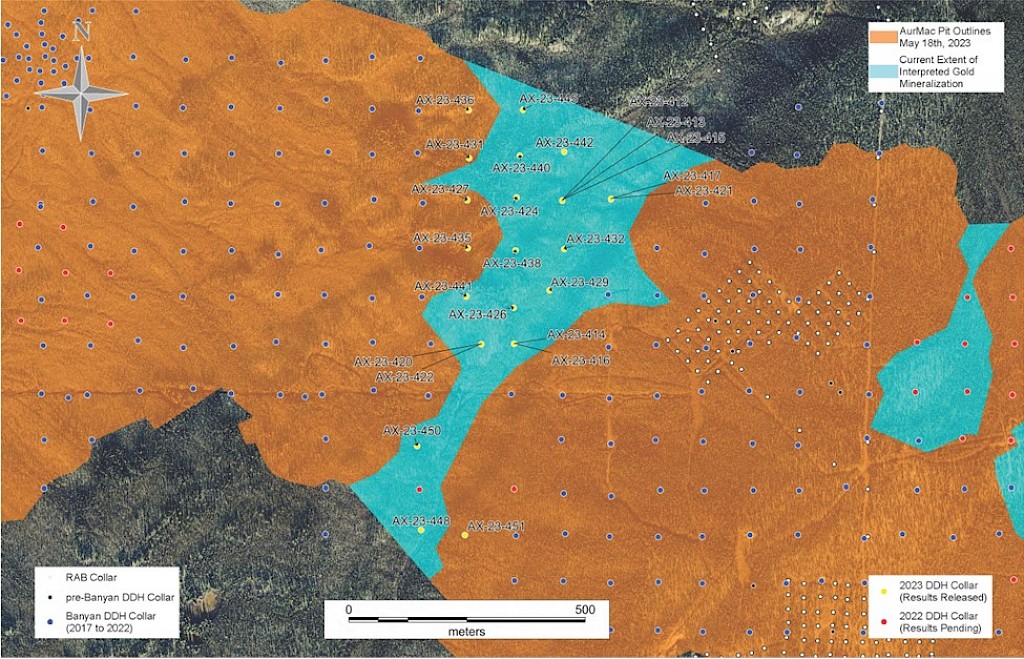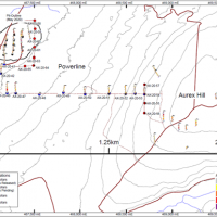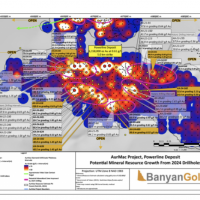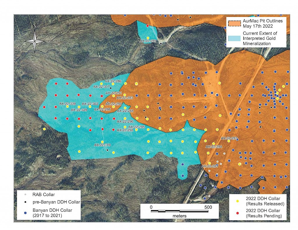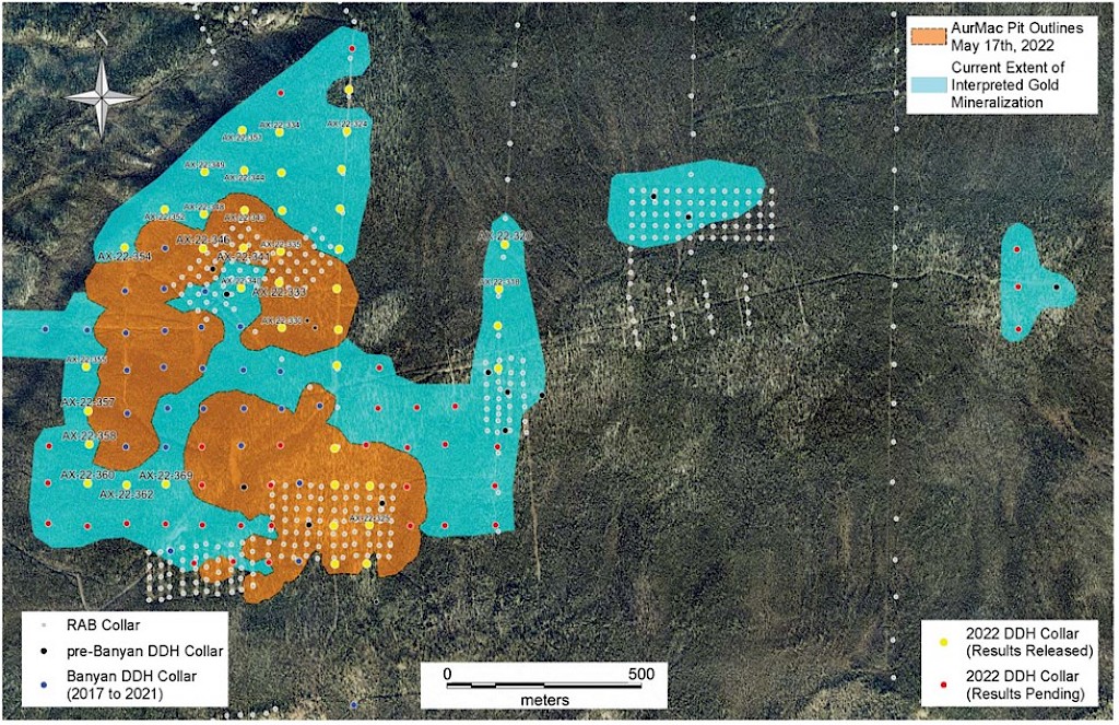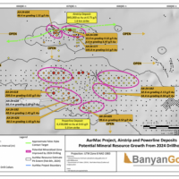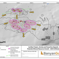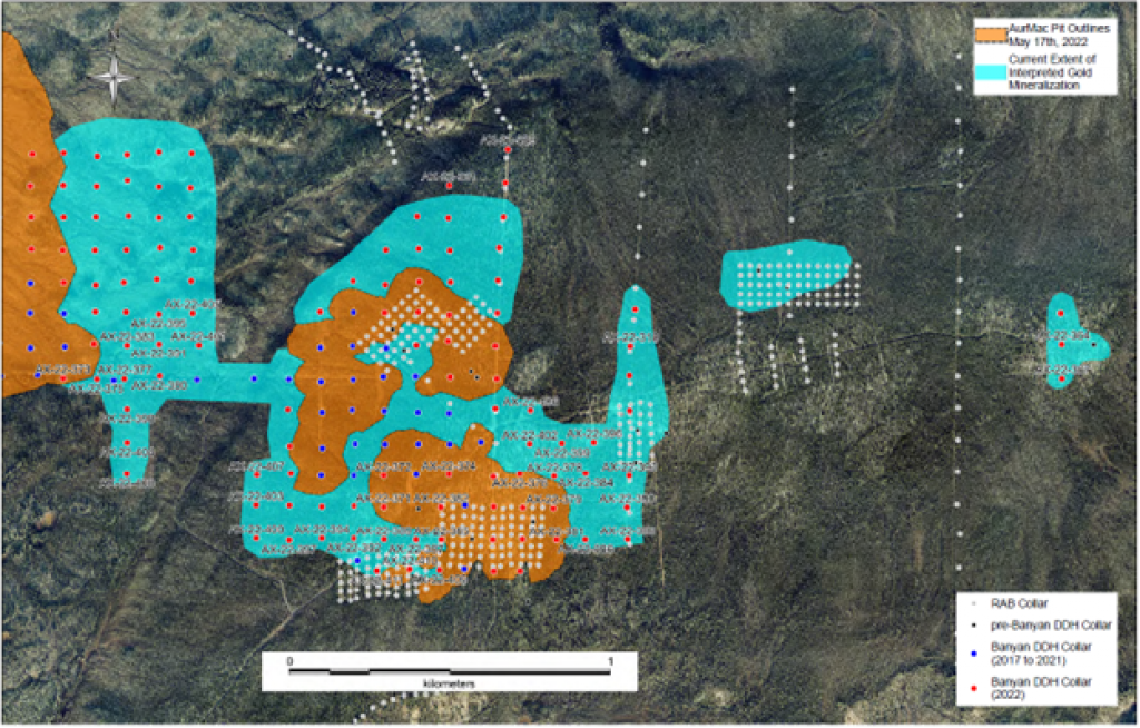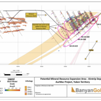 Banyan Gold Corp.’s 2022 field season commenced in late-January 2022 and consisted of approximately 50,000m of diamond drilling. Step-out drilling continued in the Powerline and Aurex Hill Zones to expand both of their mineralization footprints. In Aurex Hill, a total of 54 diamond drill holes (9,073 m) were drilled, with three holes (573 m) targeting anomalous Au is historic reverse-circulation drillholes located in the eastern portion of the zone. In the Powerline Zone, one-hundred and fifteen (115) step-out diamond drillholes (28,034m) were completed to the east and west of previous drilling bringing the total footprint width from 1.75km to its current 2.5 km.