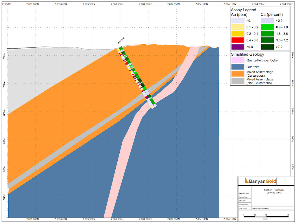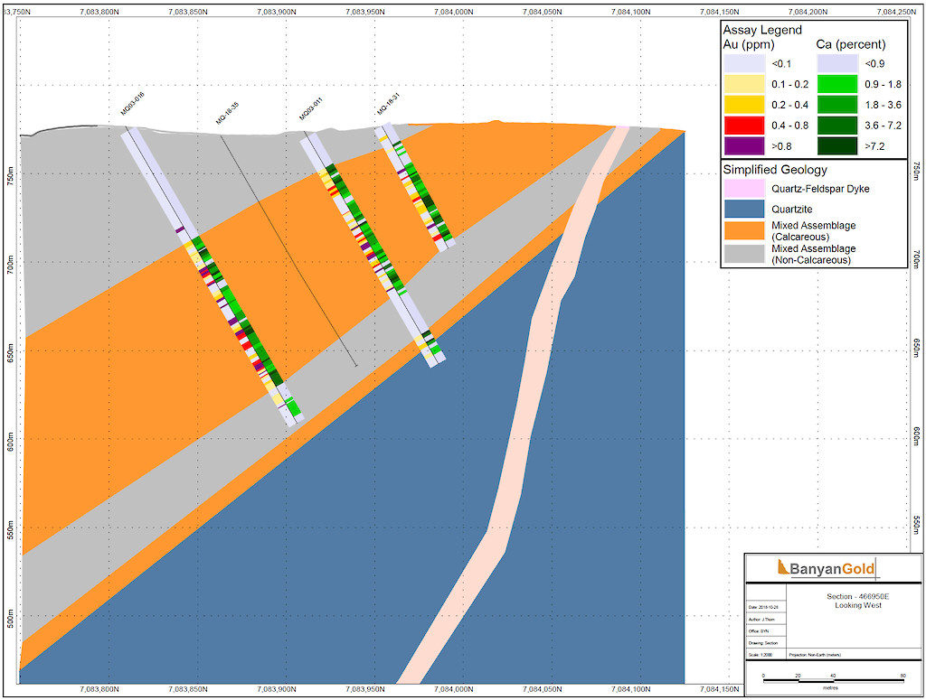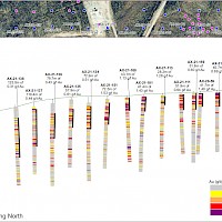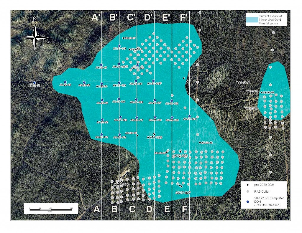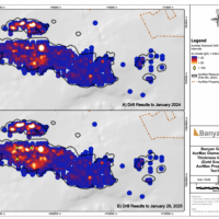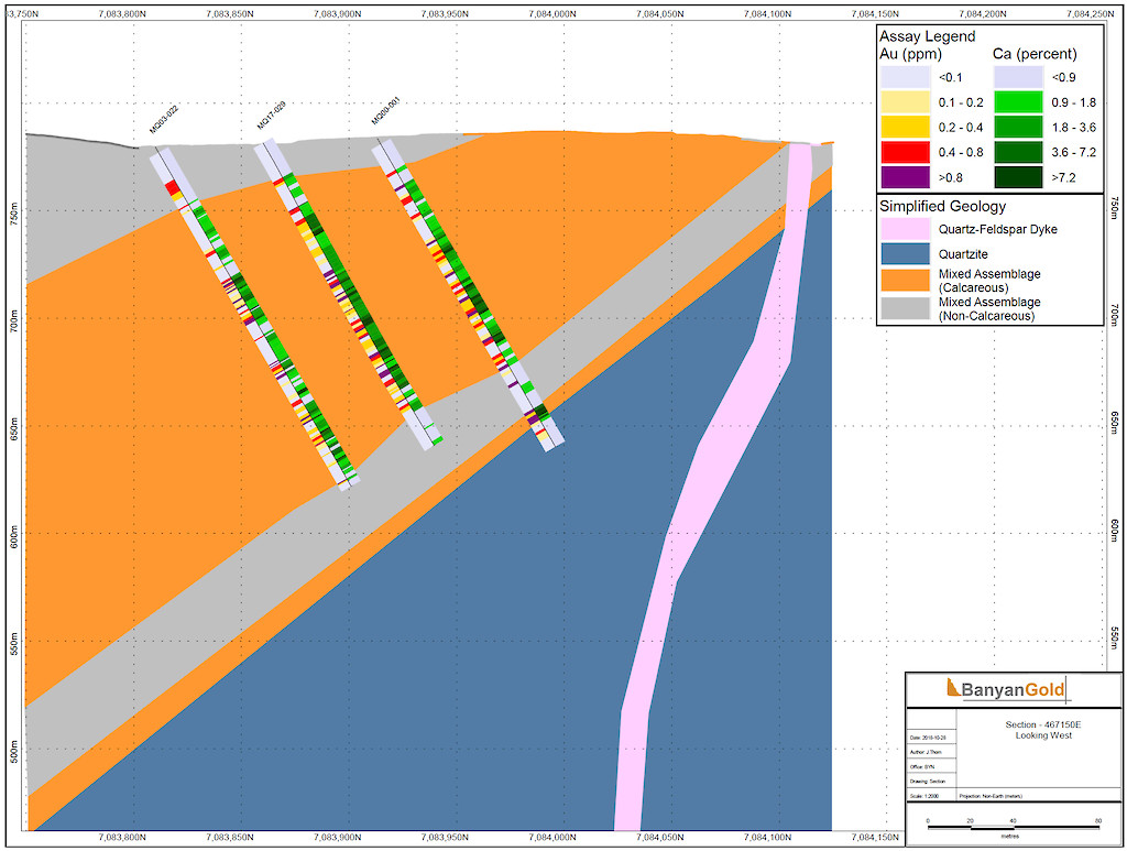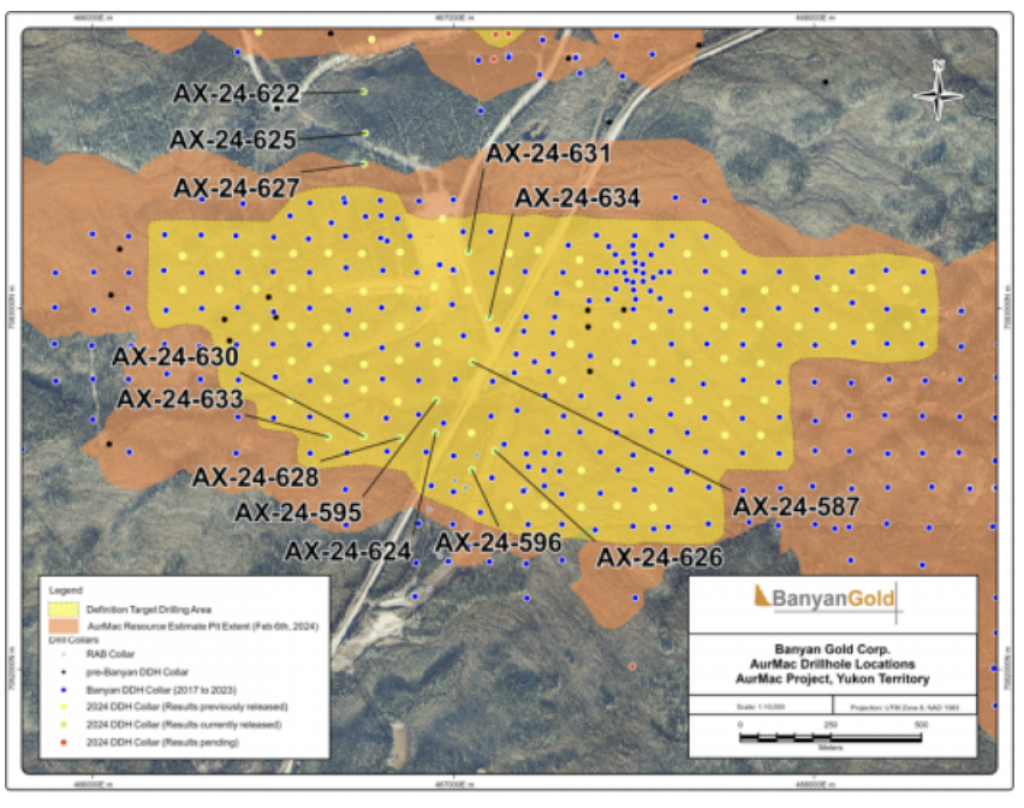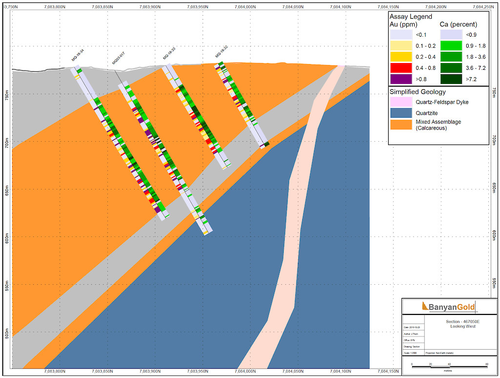 Banyan Gold Corp.’s 2022 field season commenced in late-January 2022 and consisted of approximately 50,000m of diamond drilling. Step-out drilling continued in the Powerline and Aurex Hill Zones to expand both of their mineralization footprints. In Aurex Hill, a total of 54 diamond drill holes (9,073 m) were drilled, with three holes (573 m) targeting anomalous Au is historic reverse-circulation drillholes located in the eastern portion of the zone. In the Powerline Zone, one-hundred and fifteen (115) step-out diamond drillholes (28,034m) were completed to the east and west of previous drilling bringing the total footprint width from 1.75km to its current 2.5 km.