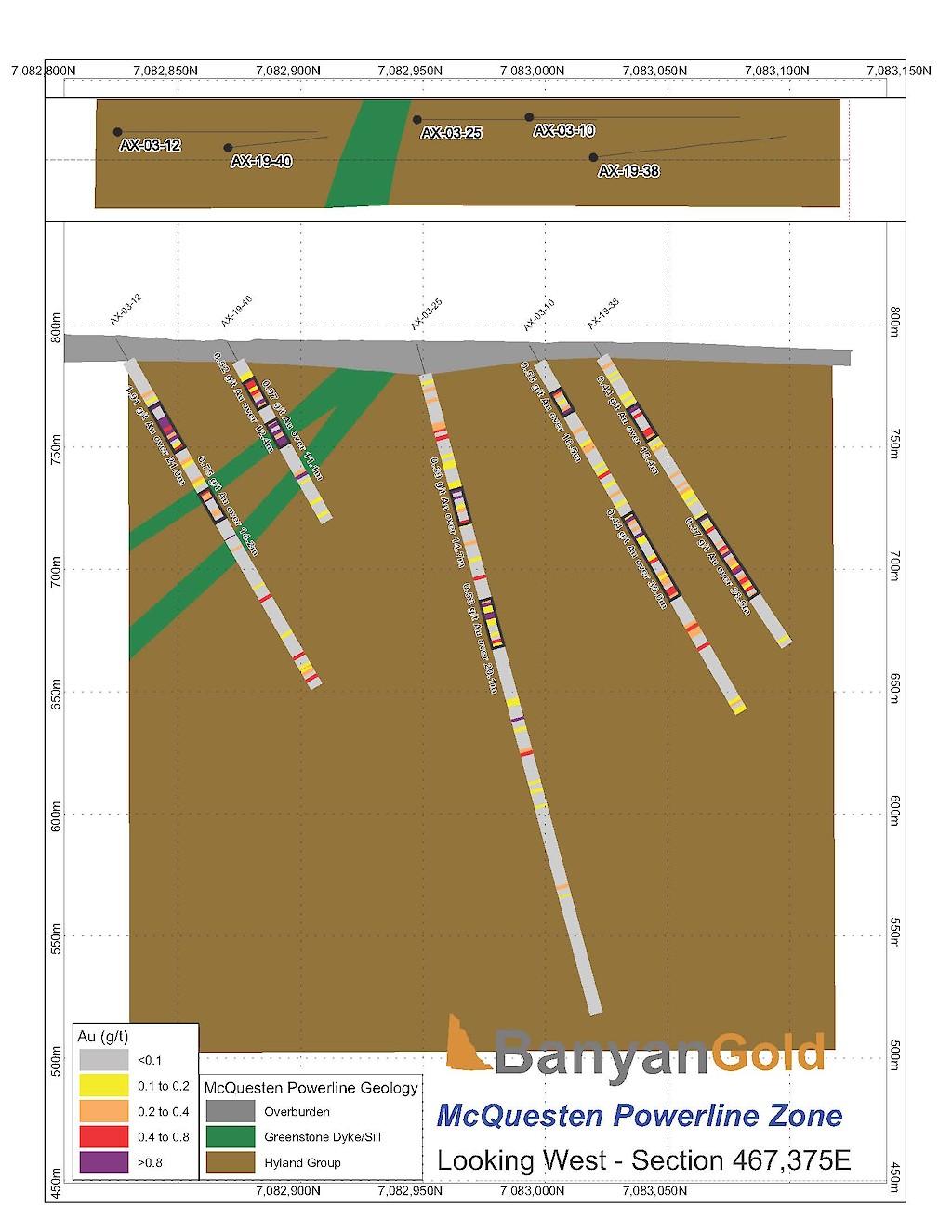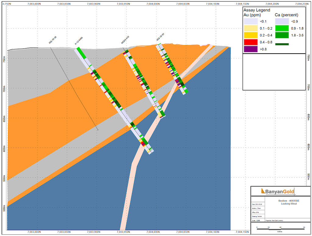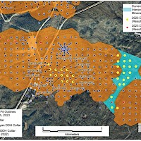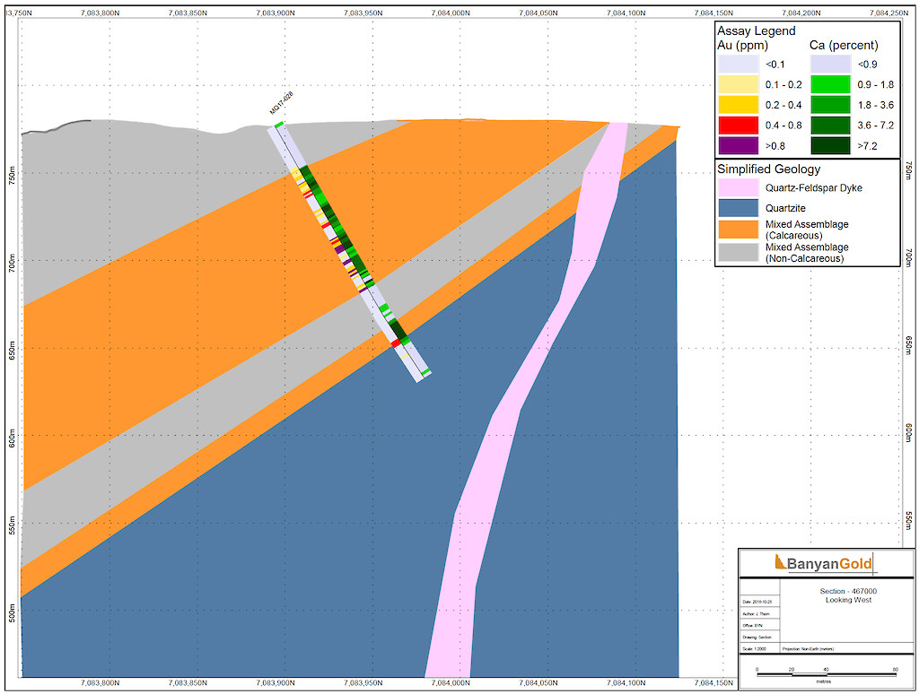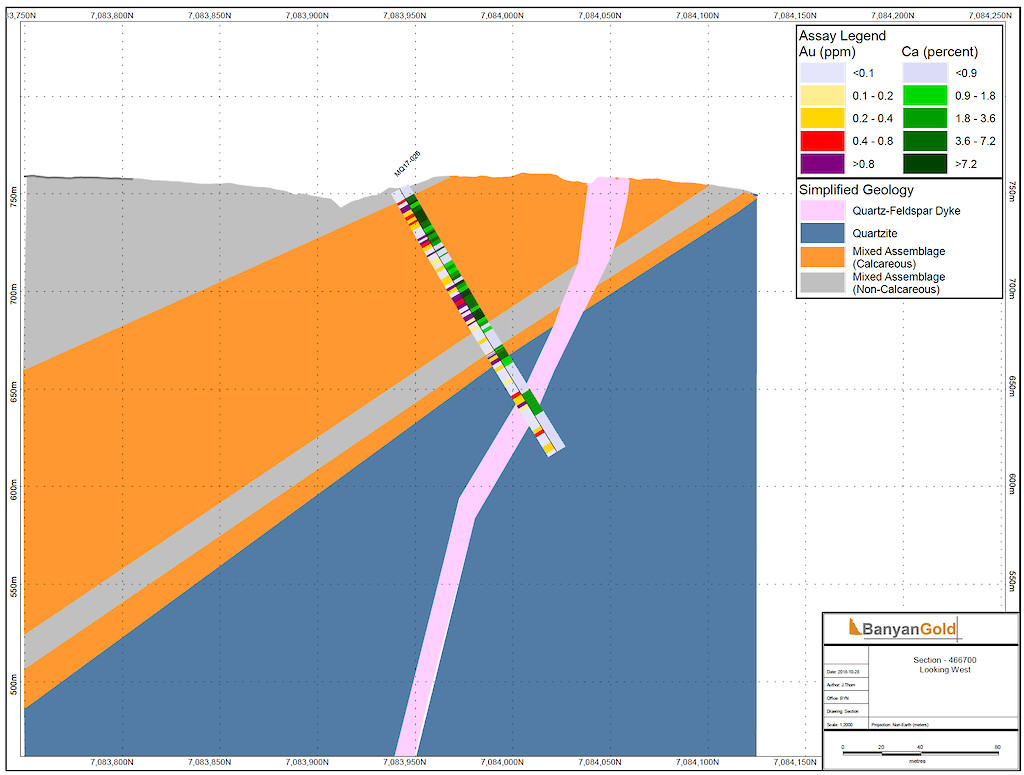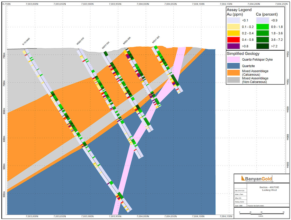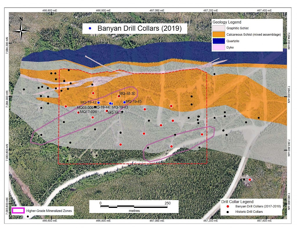 Banyan Gold Corp.’s 2022 field season commenced in late-January 2022 and consisted of approximately 50,000m of diamond drilling. Step-out drilling continued in the Powerline and Aurex Hill Zones to expand both of their mineralization footprints. In Aurex Hill, a total of 54 diamond drill holes (9,073 m) were drilled, with three holes (573 m) targeting anomalous Au is historic reverse-circulation drillholes located in the eastern portion of the zone. In the Powerline Zone, one-hundred and fifteen (115) step-out diamond drillholes (28,034m) were completed to the east and west of previous drilling bringing the total footprint width from 1.75km to its current 2.5 km.