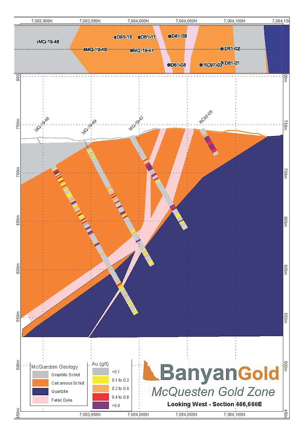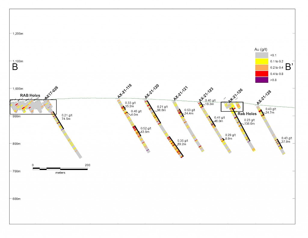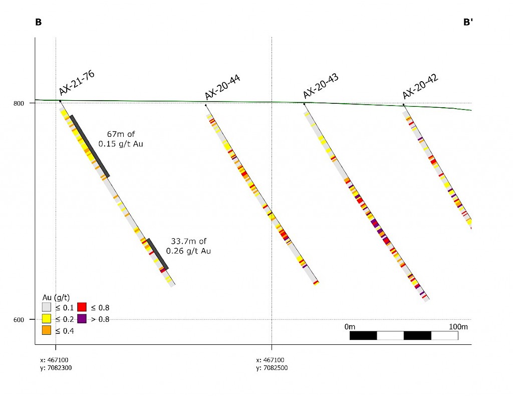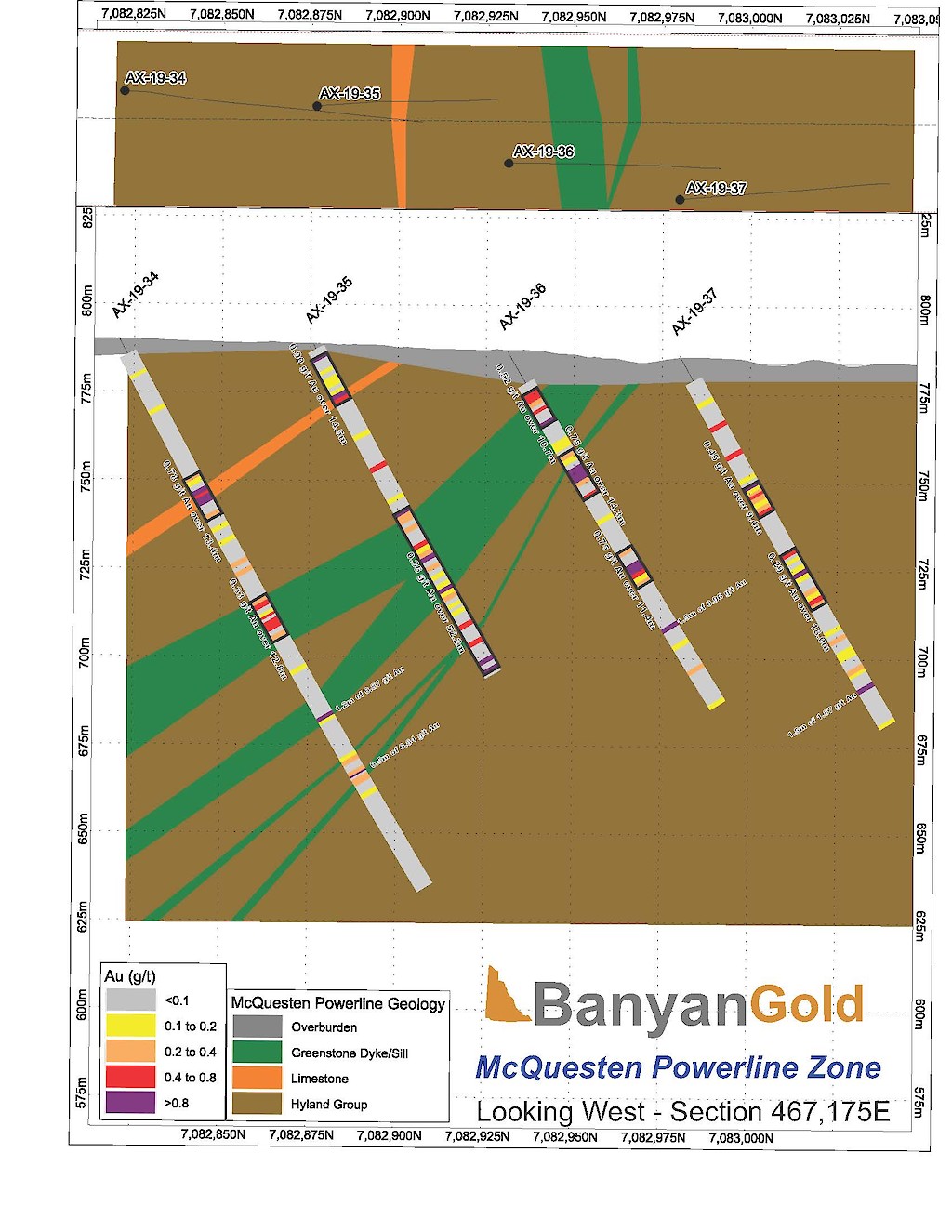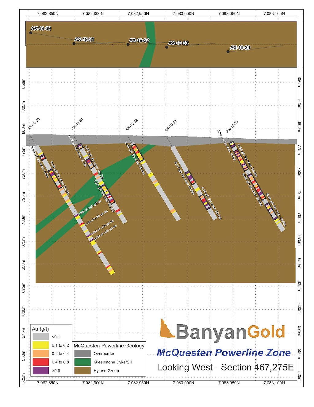 Banyan Gold Corp.’s 2022 field season commenced in late-January 2022 and consisted of approximately 50,000m of diamond drilling. Step-out drilling continued in the Powerline and Aurex Hill Zones to expand both of their mineralization footprints. In Aurex Hill, a total of 54 diamond drill holes (9,073 m) were drilled, with three holes (573 m) targeting anomalous Au is historic reverse-circulation drillholes located in the eastern portion of the zone. In the Powerline Zone, one-hundred and fifteen (115) step-out diamond drillholes (28,034m) were completed to the east and west of previous drilling bringing the total footprint width from 1.75km to its current 2.5 km.
