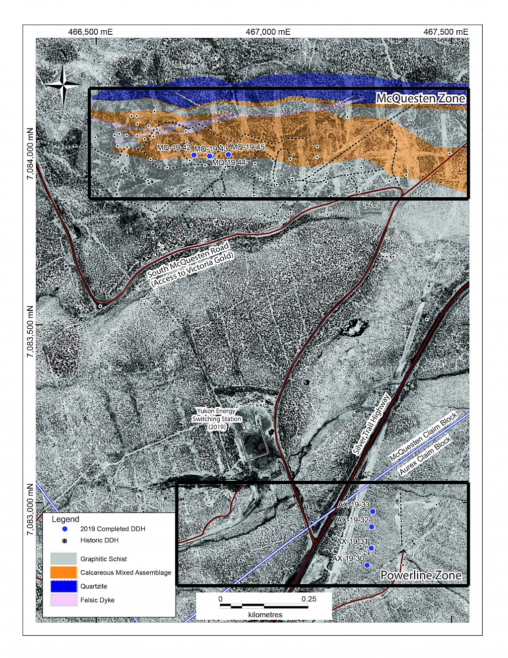 The AurMac Project lies in the northern part of the Selwyn basin and is underlain by meta-sedimentary rocks of the Devono-Mississippian Earn Group and metaclastic rocks of the Late Proterozoic Yusezyu Formation of the Hyland Group. In the McQuesten area, local narrow granitic dykes commonly intrude the metaclastic rocks and are interpreted as intrusions related to the late-Cretaceous Tombstone Intrusive Suite. Gold mineralization is associated with gold bearing skarns surrounding intrusive granitoid dykes, as well as sheeted quartz ± carbonate veins. Regionally, the Tombstone Plutonic suite rocks are spatially and genetically associated with a range of precious and base-metal occurrences including the nearby intrusion-related Eagle Gold Mine hosted within the Dublin Gulch pluton. Since acquiring the properties in 2017, the Company has expanded on the initial targeting of the Airstrip Zone, identified and expanded the over 2.5 km wide by 1 km Powerline Zone, and completed further exploration and expansion of the Aurex Hill Zone.