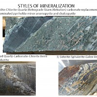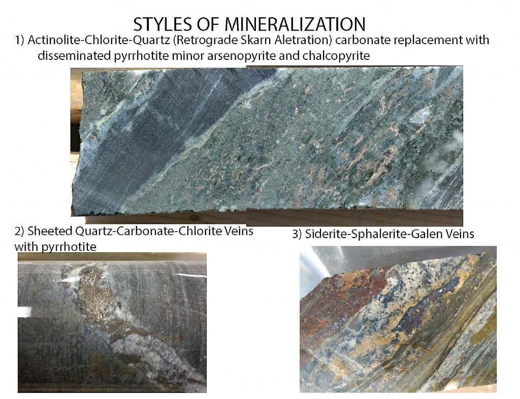 The Airstrip Zone, along the northern extent of the property, has undergone at least three stages of mineralization consisting of early gold-bearing calc – silicate – pyrrhotite skarns and multi-stage, quartz – arsenopyrite – pyrrhotite veins. Skarns commonly develop proximal to the margins of felsic dykes and have anomalous bismuth ± tungsten, antimony, and copper suggesting proximity to an extensive intrusive source. The gold-bearing quartz – arsenopyrite – pyrrhotite veins are more common in the competent Keno Hill Quartzites and occur as veins, lenses, or as vein faults in the local dilatant and fracture zones. The principal ore minerals are pyrite, arsenopyrite, and gold that generally accompanies arsenopyrite. Later, ‘Keno Hill style’ quartz and siderite veins with pyrite, galena, and sphalerite that make up the principal economic deposits of the nearby Keno Hill area, are interpreted as the last stage of mineralization.
