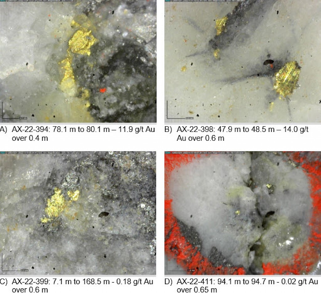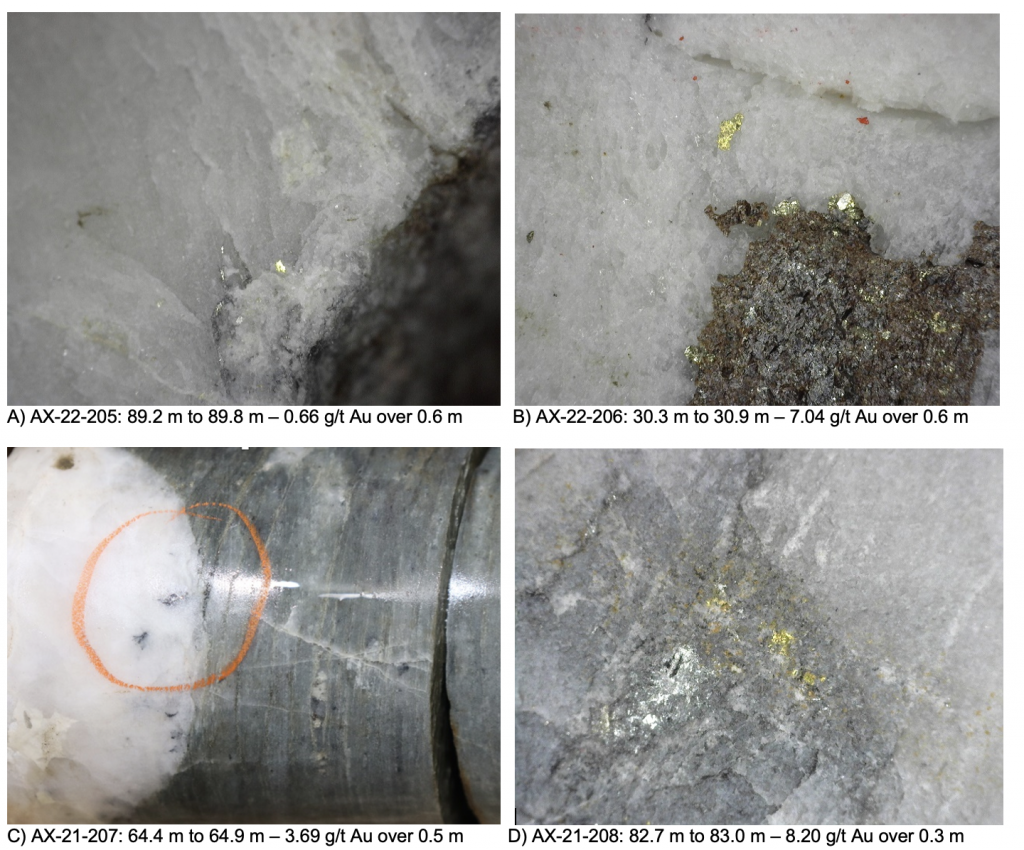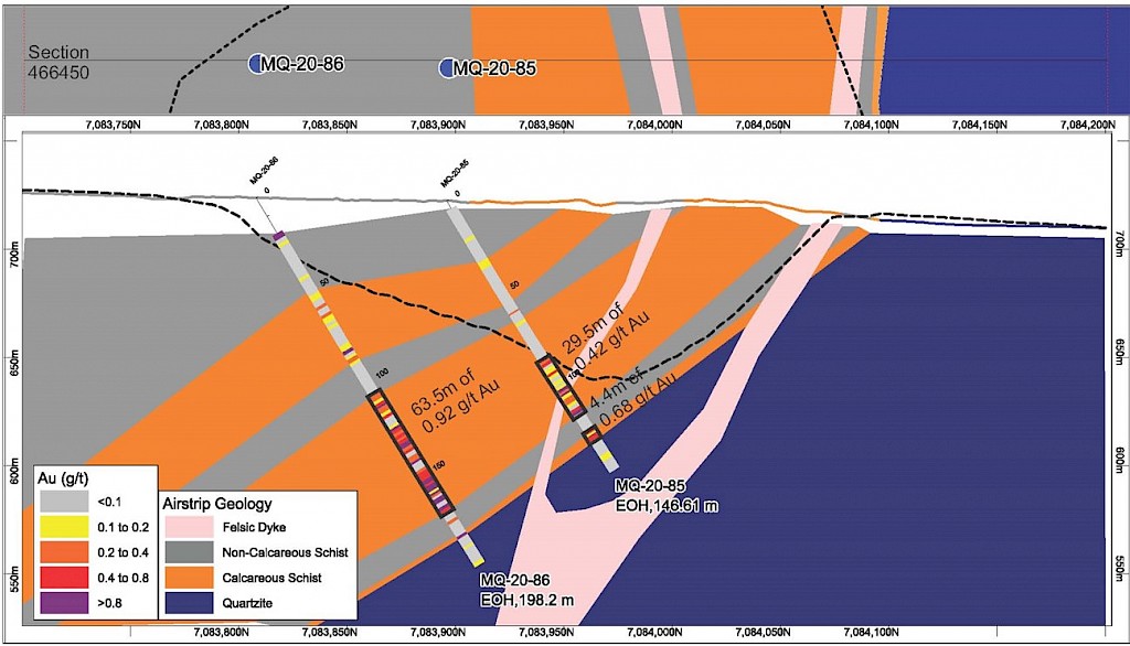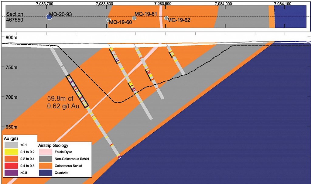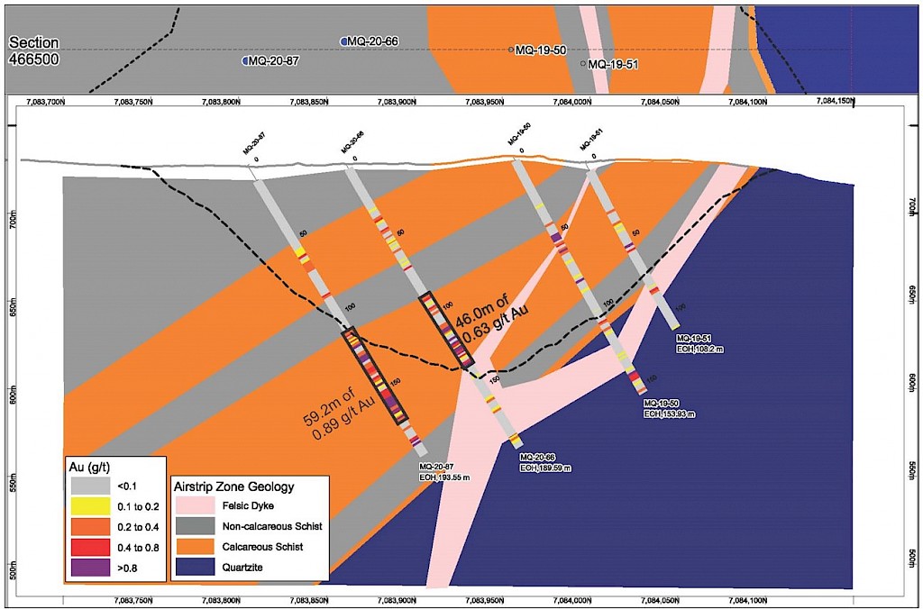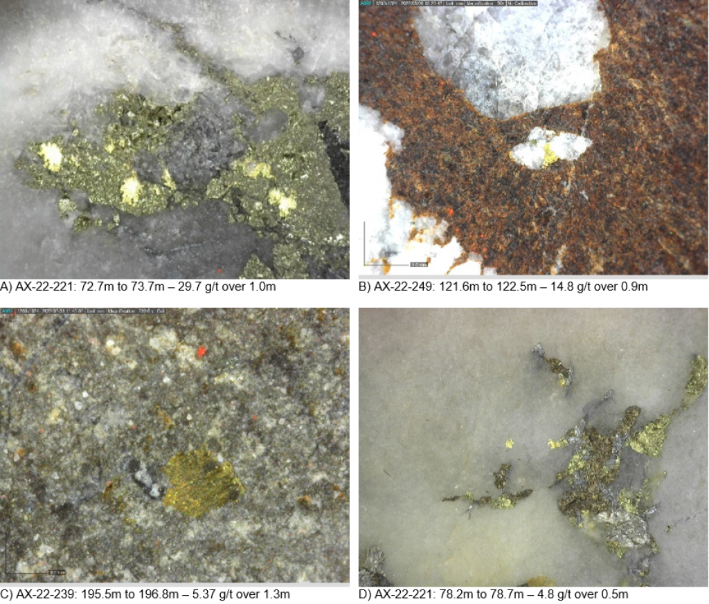 Within the Airstrip Zone, gold mineralization appears to be associated with intrusive dikes crosscutting pyrrhotite skarn altered sediments that lie above the lower quartzite. Gold mineralization within the Powerline and Aurex Hill zones is hosted within shallowly dipping sheeted veins hosting arsenopyrite – pyrite – Bi-sulphosalts along with lesser pyrrhotite-altered calcareous horizons like that in Airstrip.