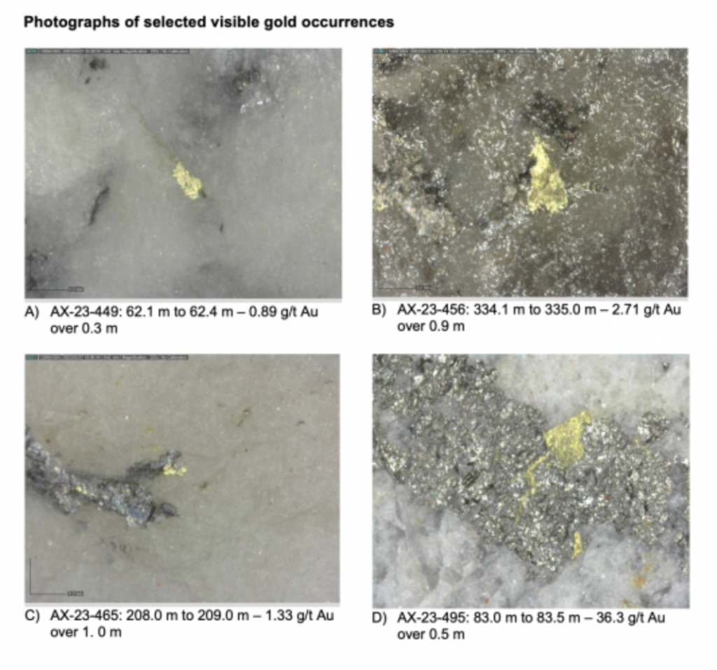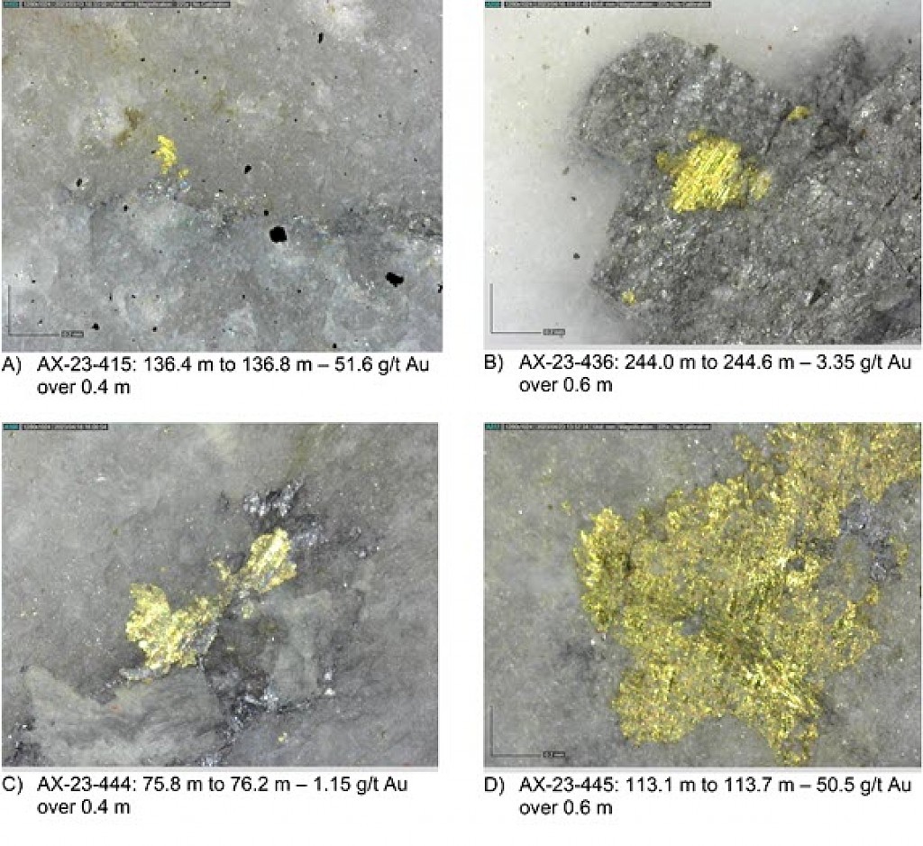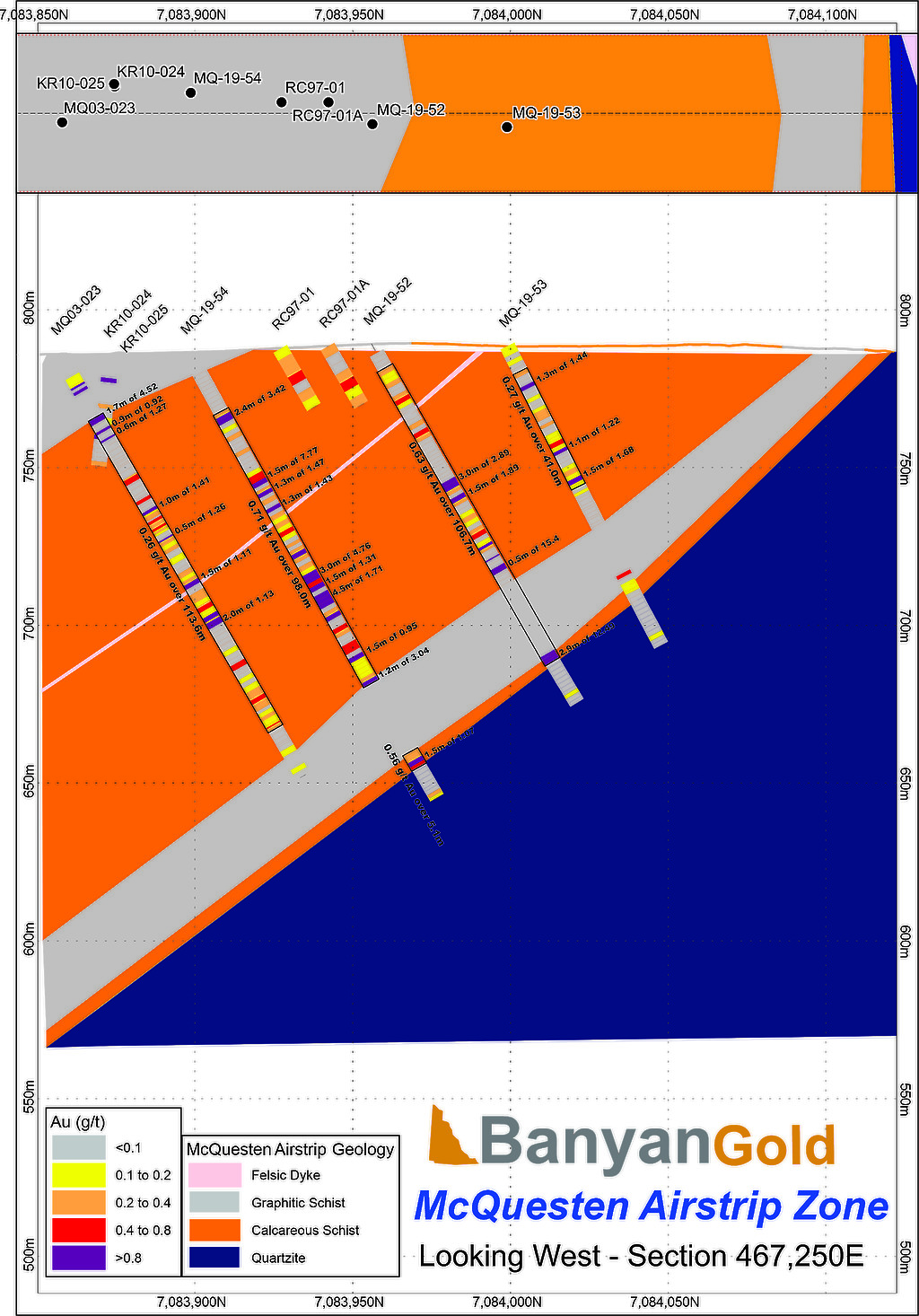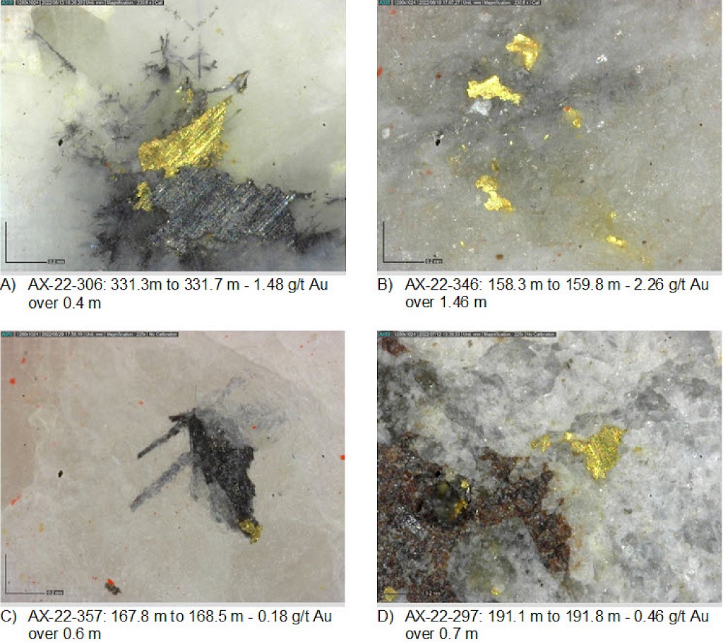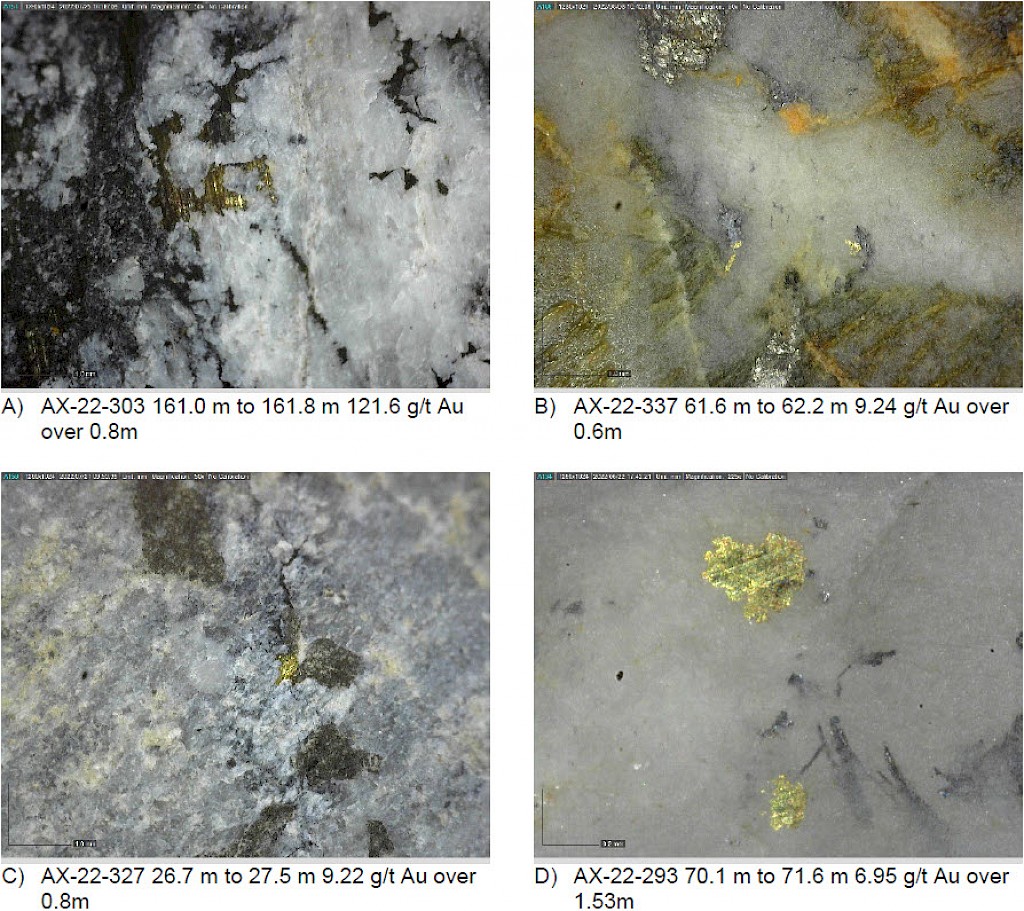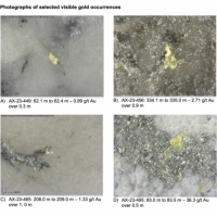 Within the Airstrip Zone, gold mineralization appears to be associated with intrusive dikes crosscutting pyrrhotite skarn altered sediments that lie above the lower quartzite. Gold mineralization within the Powerline and Aurex Hill zones is hosted within shallowly dipping sheeted veins hosting arsenopyrite – pyrite – Bi-sulphosalts along with lesser pyrrhotite-altered calcareous horizons like that in Airstrip.