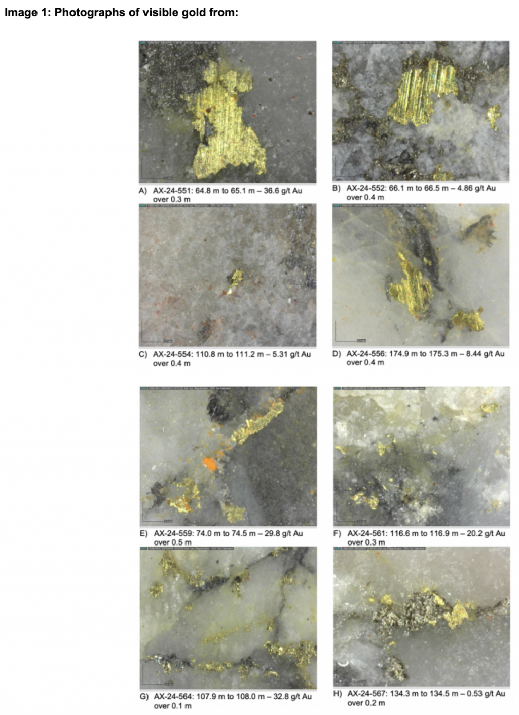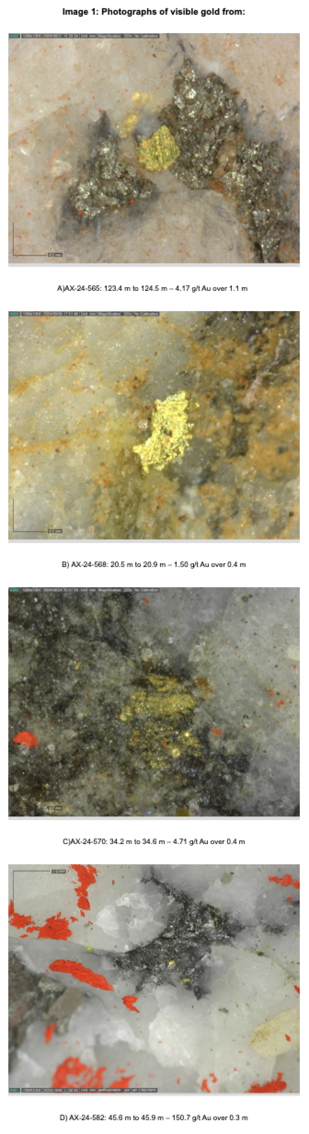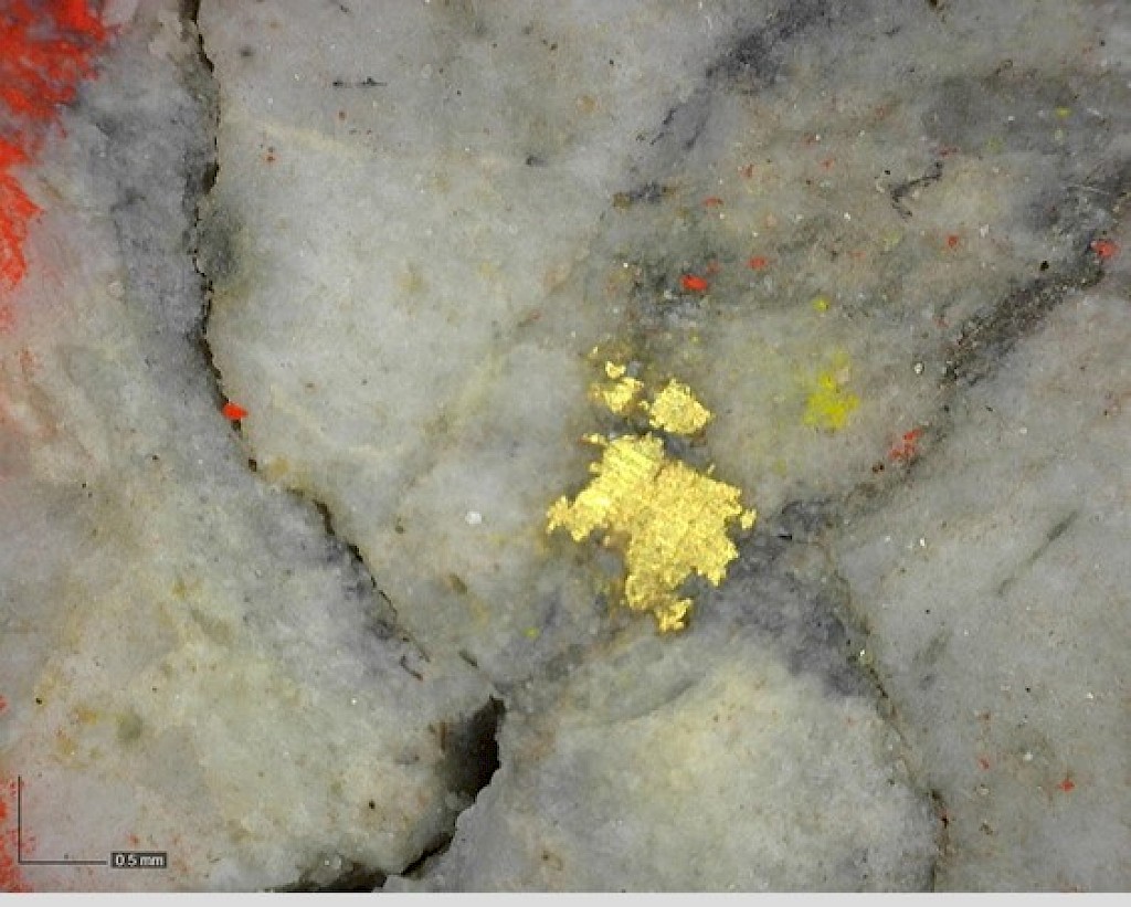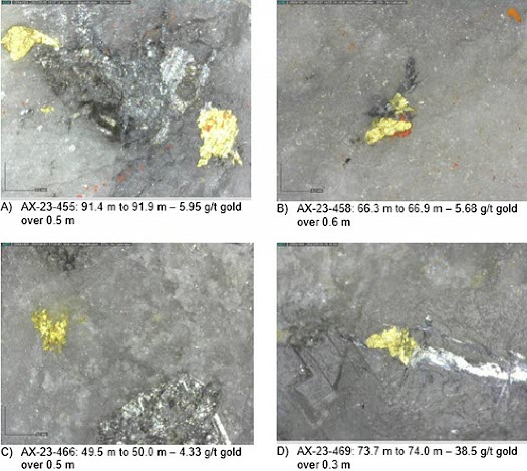 Within the Airstrip Zone, gold mineralization appears to be associated with intrusive dikes crosscutting pyrrhotite skarn altered sediments that lie above the lower quartzite. Gold mineralization within the Powerline and Aurex Hill zones is hosted within shallowly dipping sheeted veins hosting arsenopyrite – pyrite – Bi-sulphosalts along with lesser pyrrhotite-altered calcareous horizons like that in Airstrip.