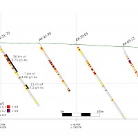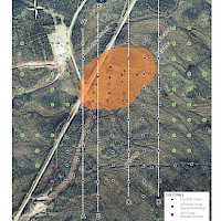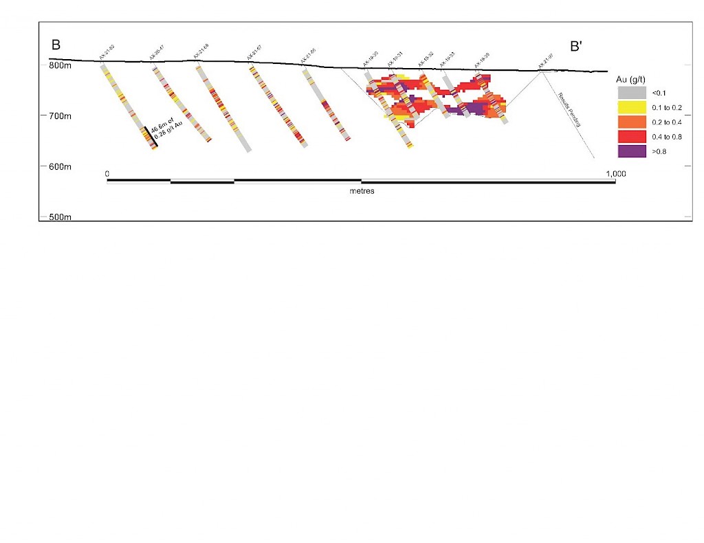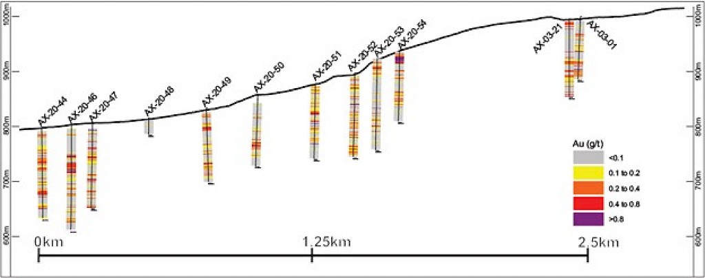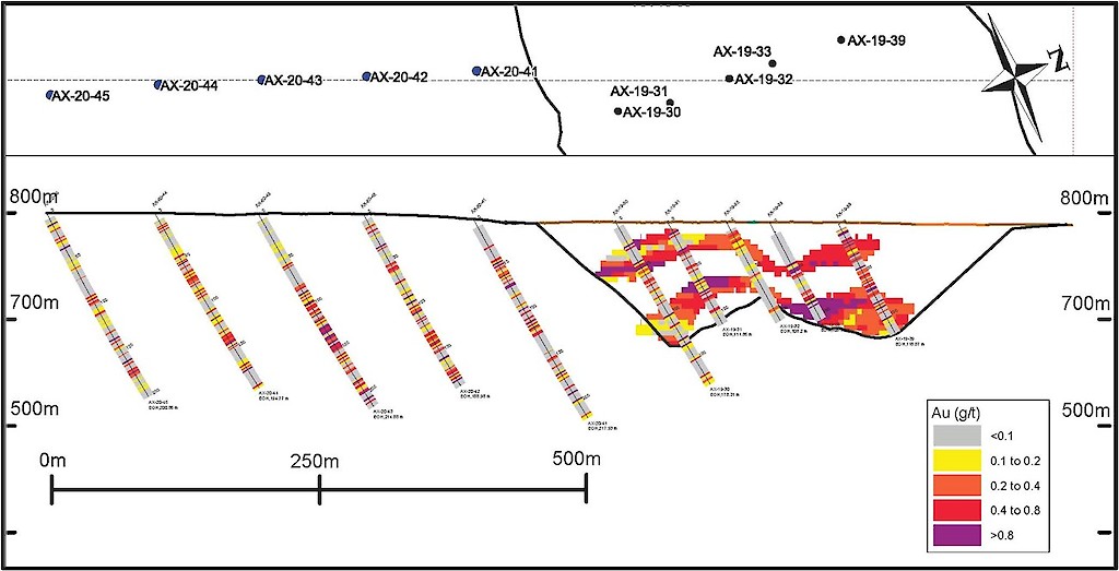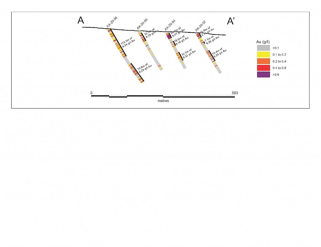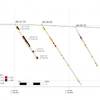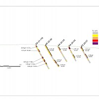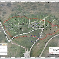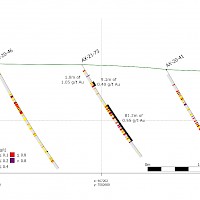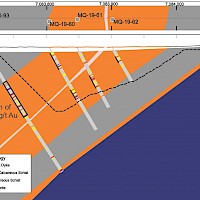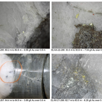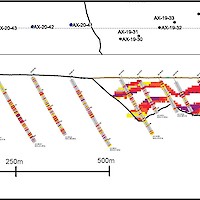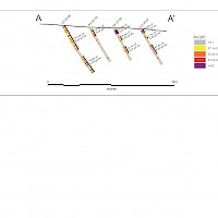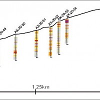 Work carried out in 2019 included two (2) new trenches in the Airstrip Zone totalling 175 m, twenty-three (23) diamond drillholes totalling 3,012 m, and five reverse-circulation drillholes totalling 497 m. Four of the diamond drillholes (494 m) and reverse-circulation drilling were designed to infill around higher-grade intercepts within earlier drilling of the Airstrip Zone. A second phase of step out drilling comprised of nineteen diamond drillholes (2,518 m). Inaugural drilling of the Powerline Zone occurred in 2019 intended to step out from three historic diamond drill holes completed in 2003. In total eleven holes were drilled (1,375 m) and returned anomalous Au intercepts.