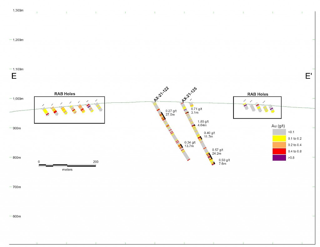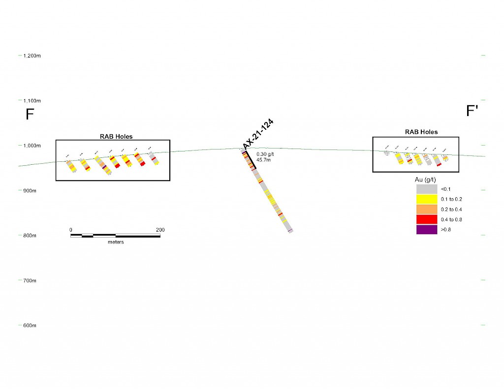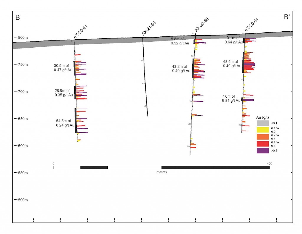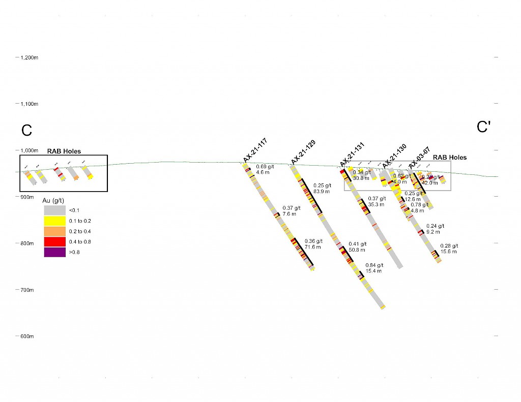 Work carried out in 2019 included two (2) new trenches in the Airstrip Zone totalling 175 m, twenty-three (23) diamond drillholes totalling 3,012 m, and five reverse-circulation drillholes totalling 497 m. Four of the diamond drillholes (494 m) and reverse-circulation drilling were designed to infill around higher-grade intercepts within earlier drilling of the Airstrip Zone. A second phase of step out drilling comprised of nineteen diamond drillholes (2,518 m). Inaugural drilling of the Powerline Zone occurred in 2019 intended to step out from three historic diamond drill holes completed in 2003. In total eleven holes were drilled (1,375 m) and returned anomalous Au intercepts.