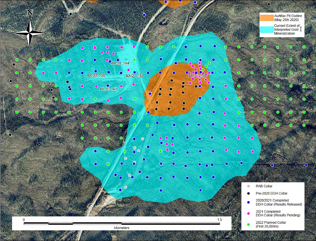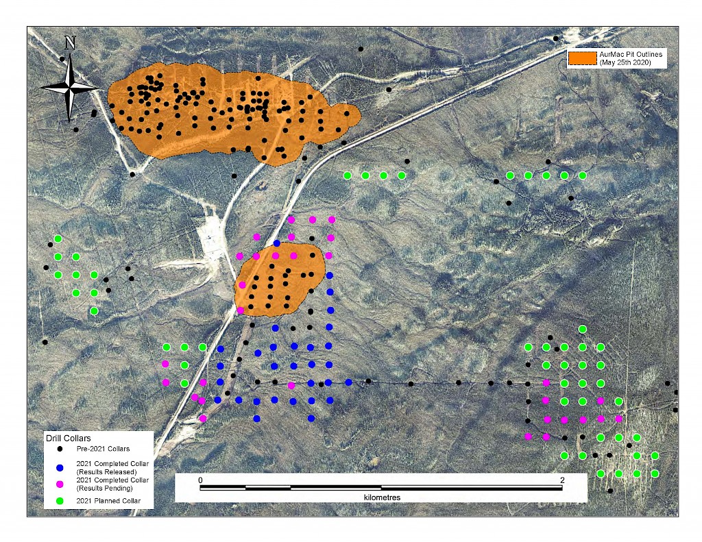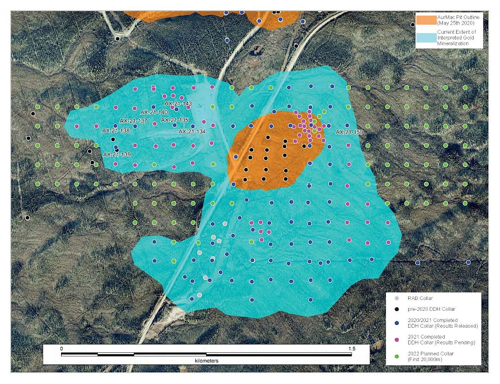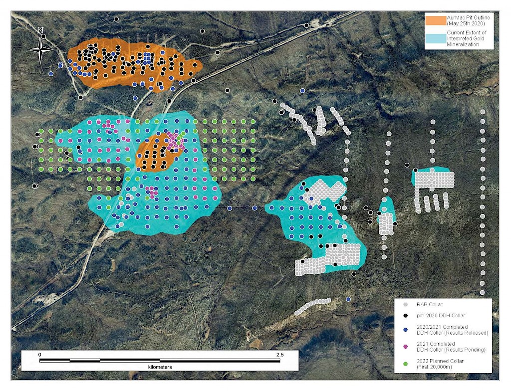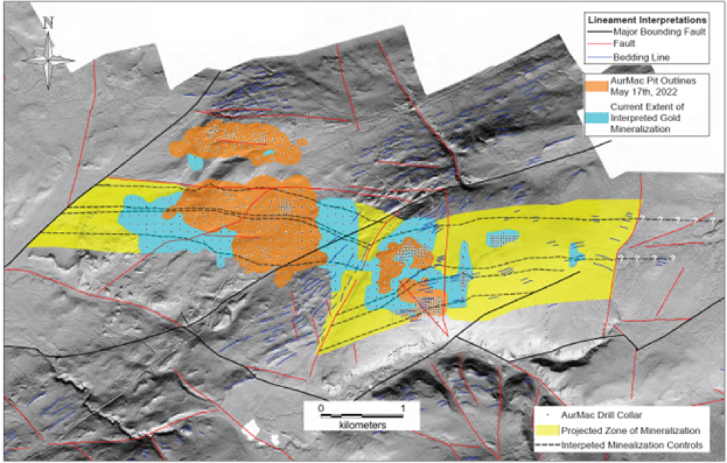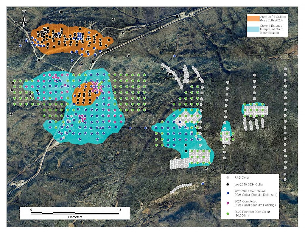 On May 17, 2022, a resource update was released for the AurMac Project culminating from all the work completed from 2017-2021. The inferred resource for the entire project totalled 3,990,000 oz Au with an average grade of 0.60 g/t and cut-offs ranging from 0.2-0.3 g/t Au. Zone-wise, Airstrip totalled 875 koz Au at 0.64 g/t Au with a 0.2 g/t Au cut-off, Powerline totalled 2,989 koz Au grading 0.59 g/t Au with a 0.2 g/t Au cut-off, and Aurex Hill’s maiden resource totalled 215 koz Au grading 0.53 g/t Au with a 0.3 g/t Au cut-off.