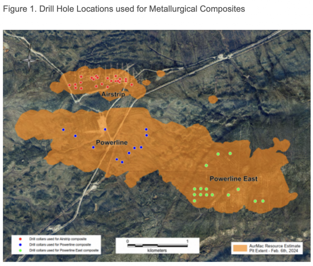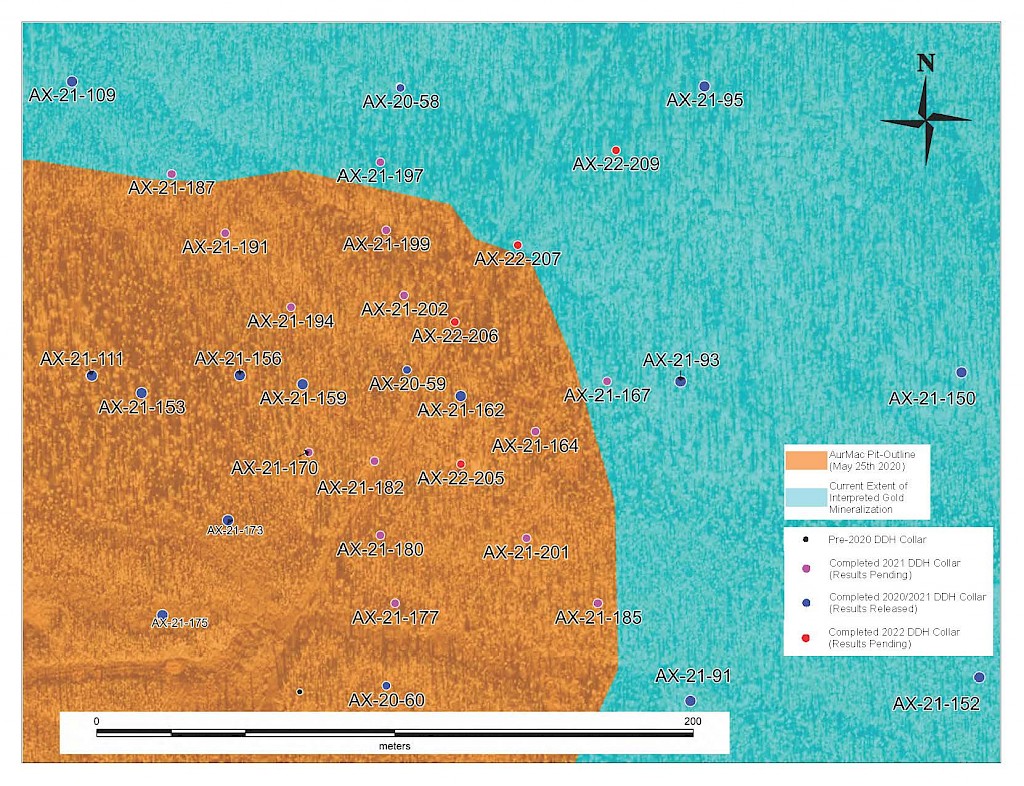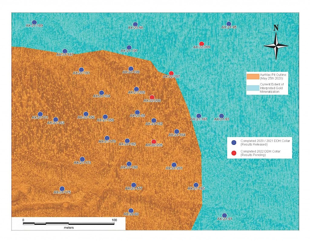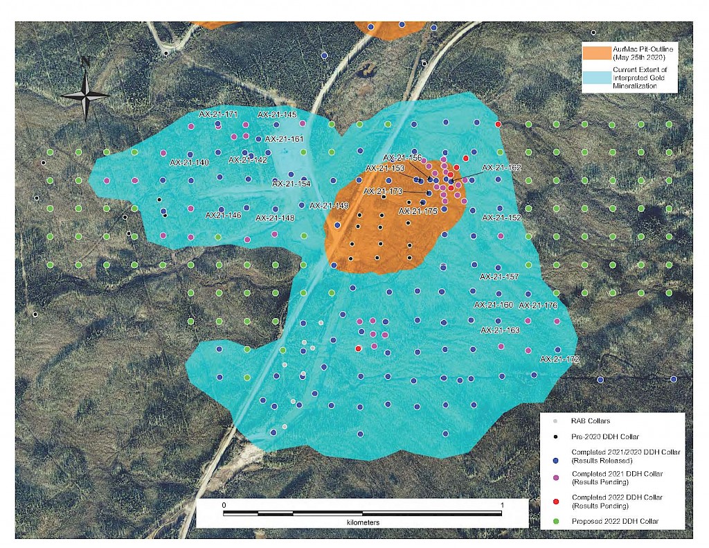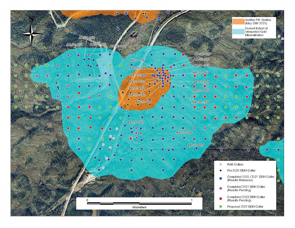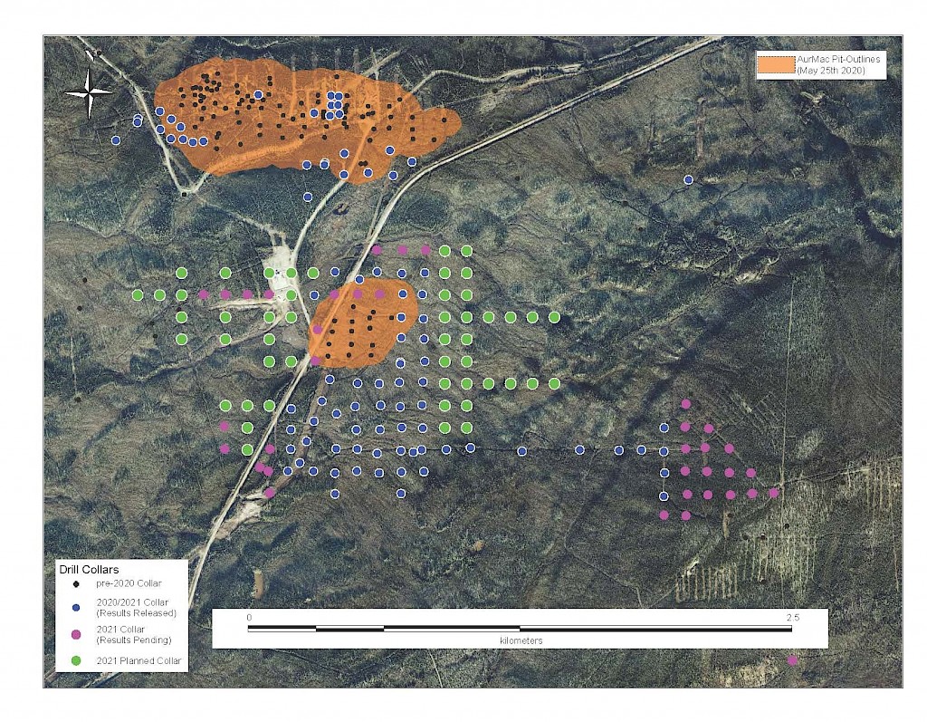 On May 17, 2022, a resource update was released for the AurMac Project culminating from all the work completed from 2017-2021. The inferred resource for the entire project totalled 3,990,000 oz Au with an average grade of 0.60 g/t and cut-offs ranging from 0.2-0.3 g/t Au. Zone-wise, Airstrip totalled 875 koz Au at 0.64 g/t Au with a 0.2 g/t Au cut-off, Powerline totalled 2,989 koz Au grading 0.59 g/t Au with a 0.2 g/t Au cut-off, and Aurex Hill’s maiden resource totalled 215 koz Au grading 0.53 g/t Au with a 0.3 g/t Au cut-off.