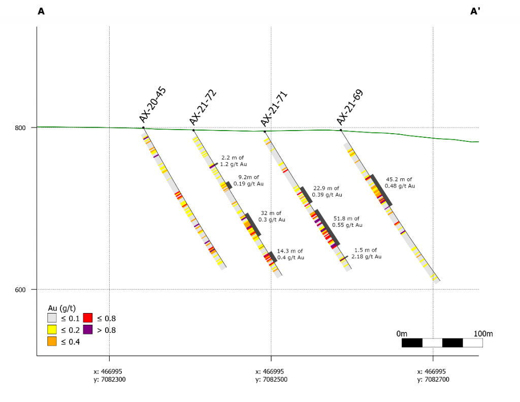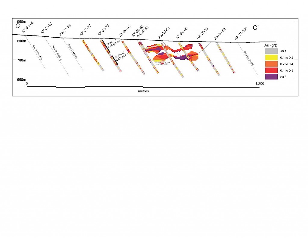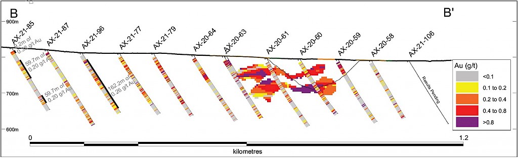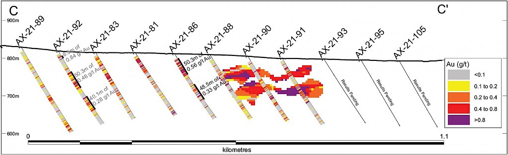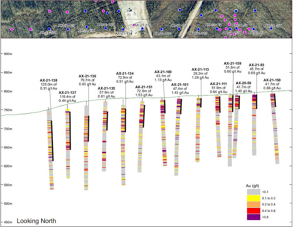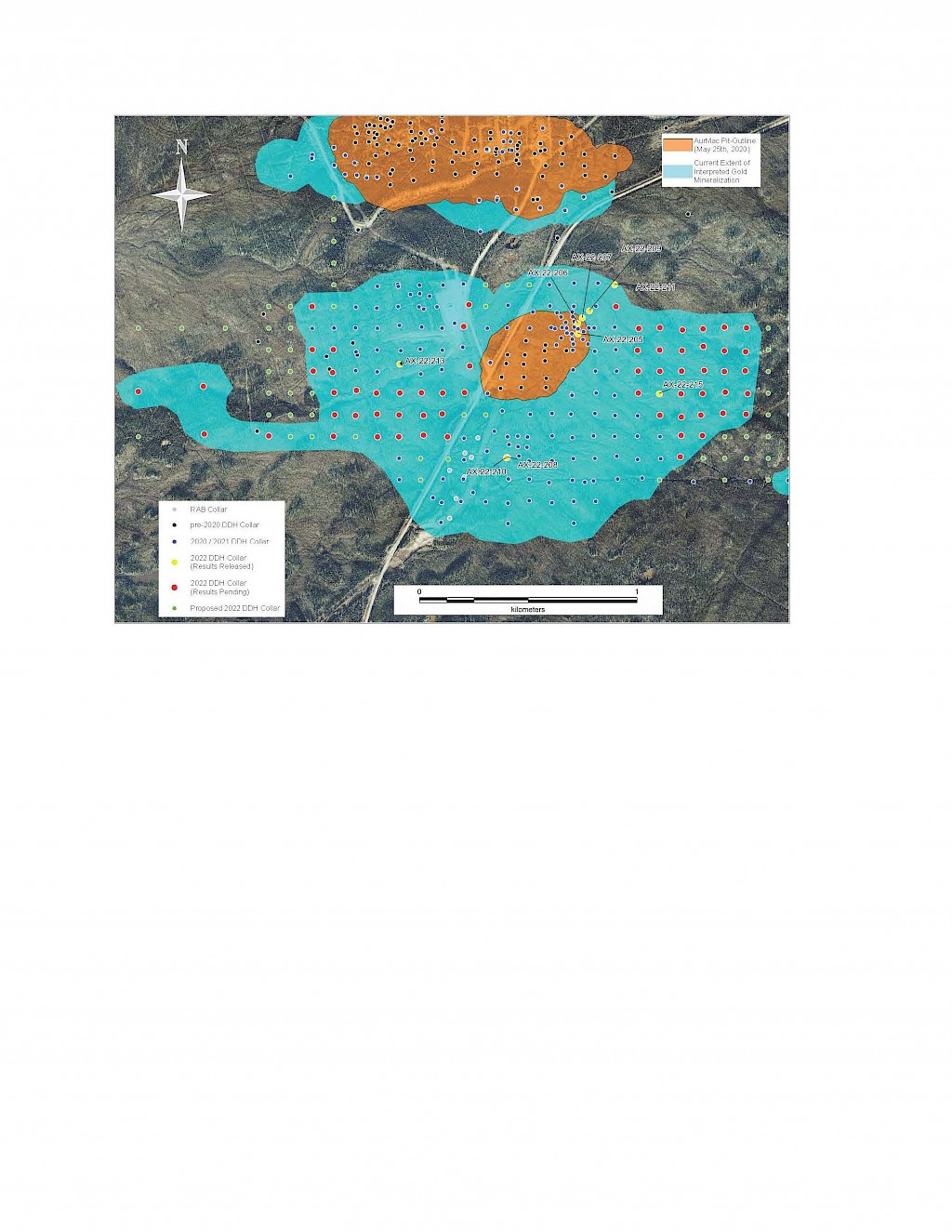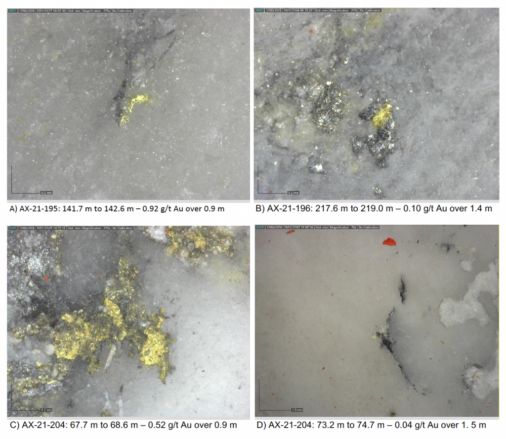 On May 17, 2022, a resource update was released for the AurMac Project culminating from all the work completed from 2017-2021. The inferred resource for the entire project totalled 3,990,000 oz Au with an average grade of 0.60 g/t and cut-offs ranging from 0.2-0.3 g/t Au. Zone-wise, Airstrip totalled 875 koz Au at 0.64 g/t Au with a 0.2 g/t Au cut-off, Powerline totalled 2,989 koz Au grading 0.59 g/t Au with a 0.2 g/t Au cut-off, and Aurex Hill’s maiden resource totalled 215 koz Au grading 0.53 g/t Au with a 0.3 g/t Au cut-off.