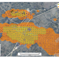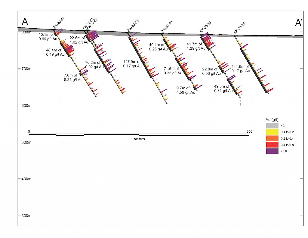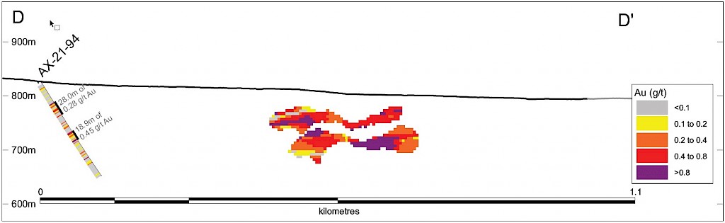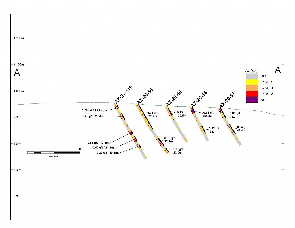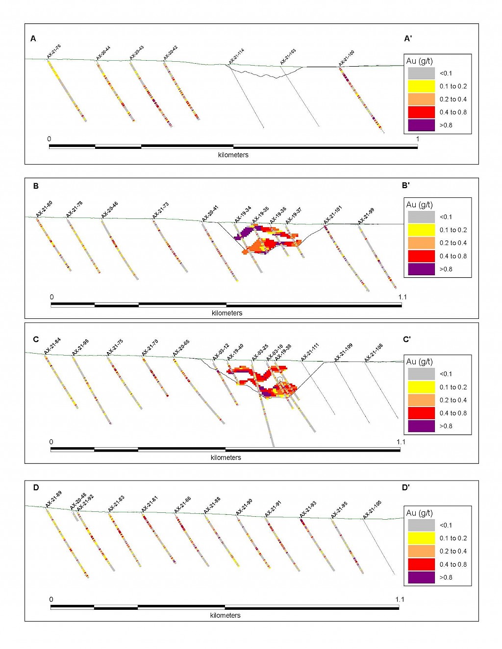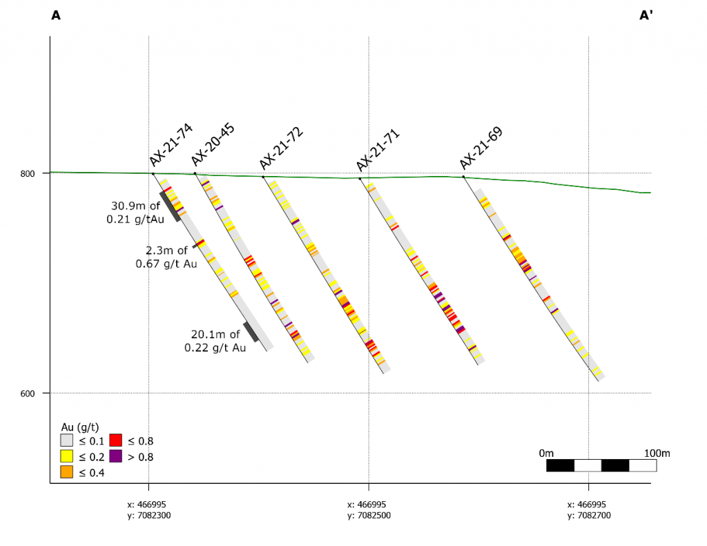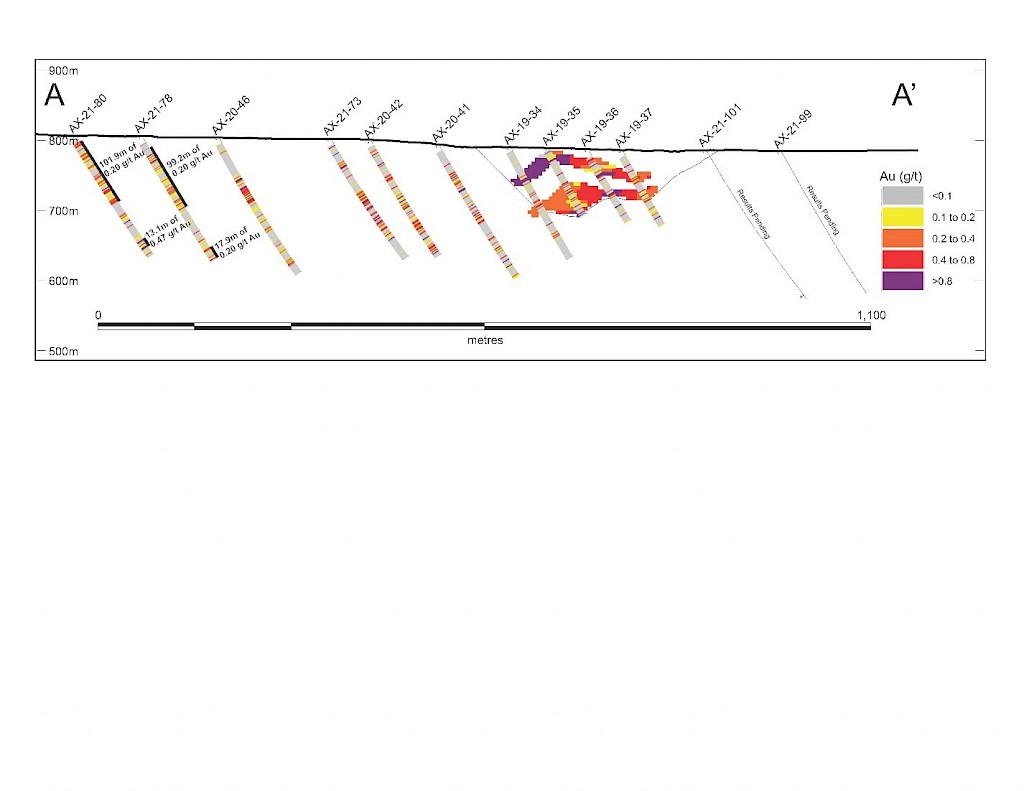 On May 17, 2022, a resource update was released for the AurMac Project culminating from all the work completed from 2017-2021. The inferred resource for the entire project totalled 3,990,000 oz Au with an average grade of 0.60 g/t and cut-offs ranging from 0.2-0.3 g/t Au. Zone-wise, Airstrip totalled 875 koz Au at 0.64 g/t Au with a 0.2 g/t Au cut-off, Powerline totalled 2,989 koz Au grading 0.59 g/t Au with a 0.2 g/t Au cut-off, and Aurex Hill’s maiden resource totalled 215 koz Au grading 0.53 g/t Au with a 0.3 g/t Au cut-off.