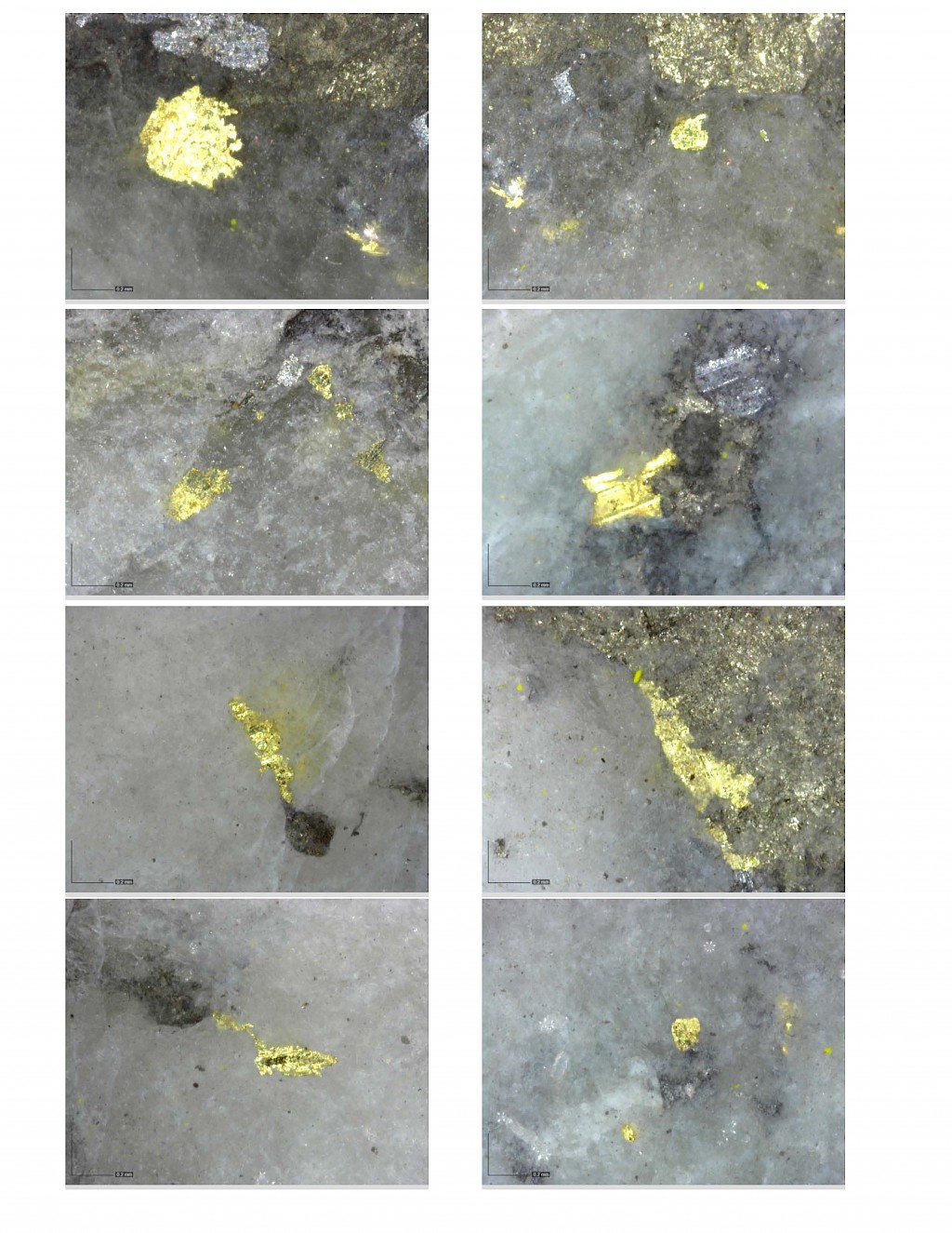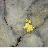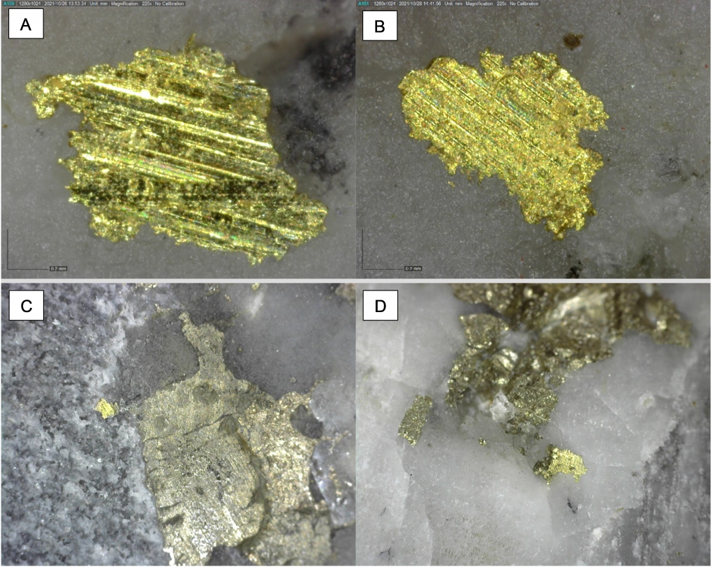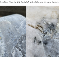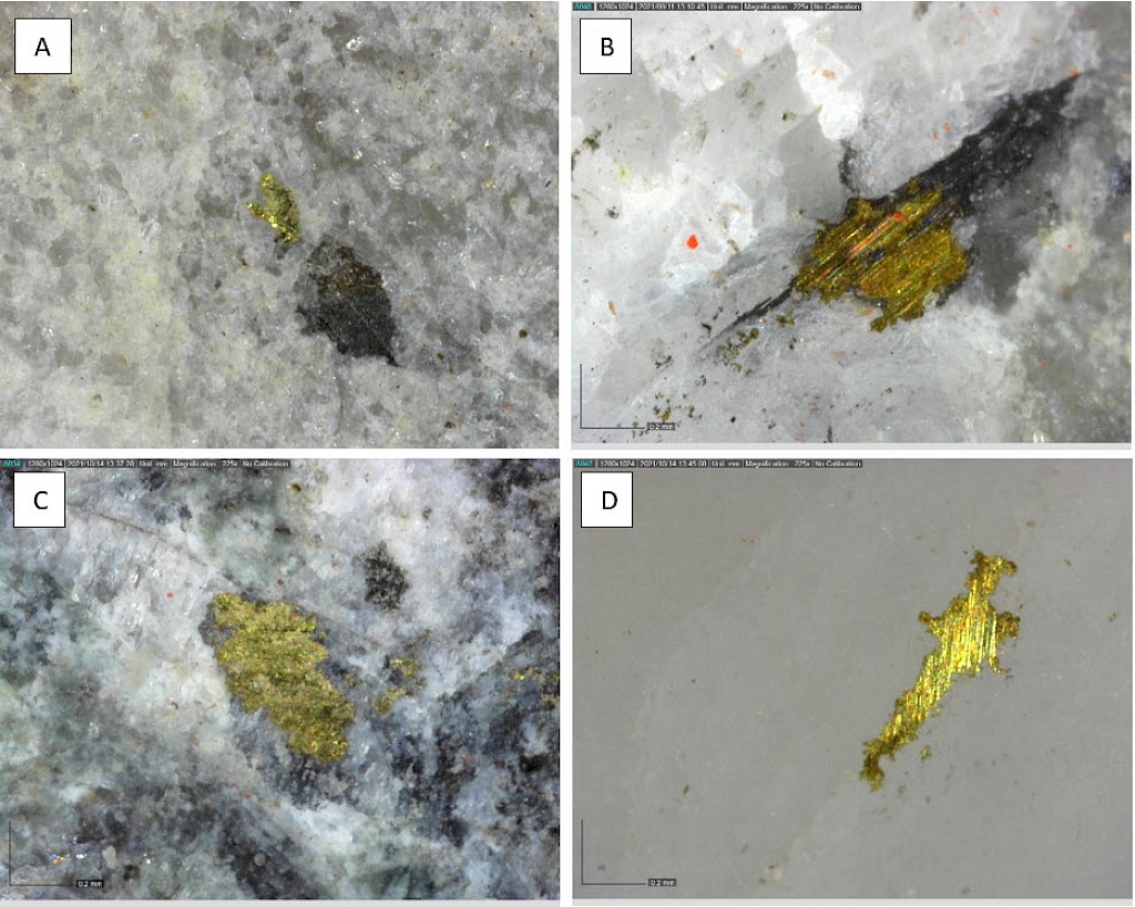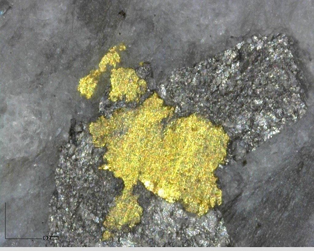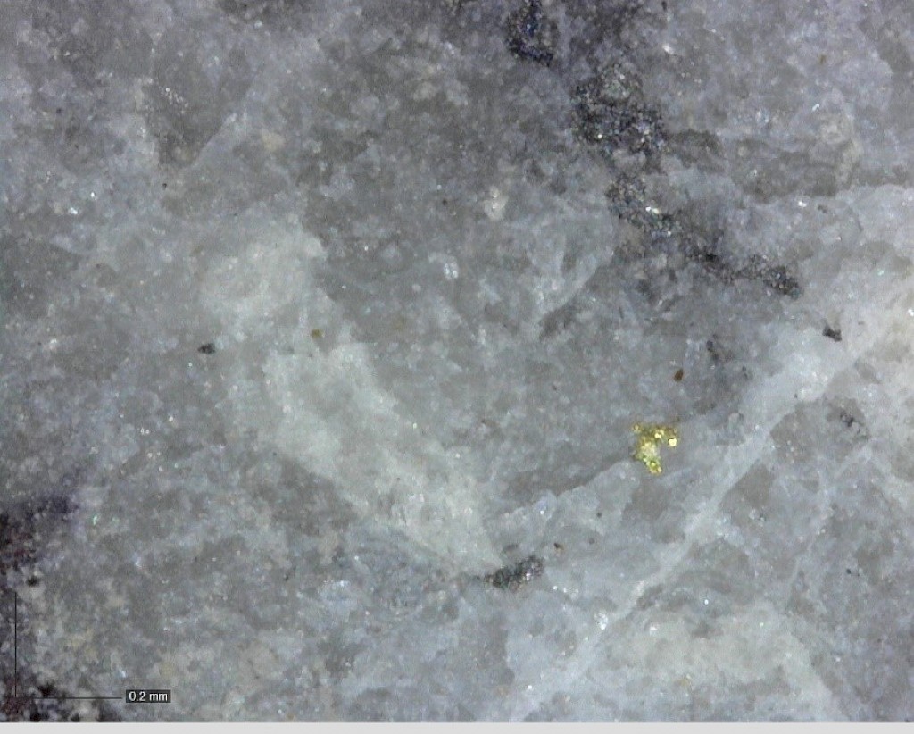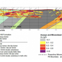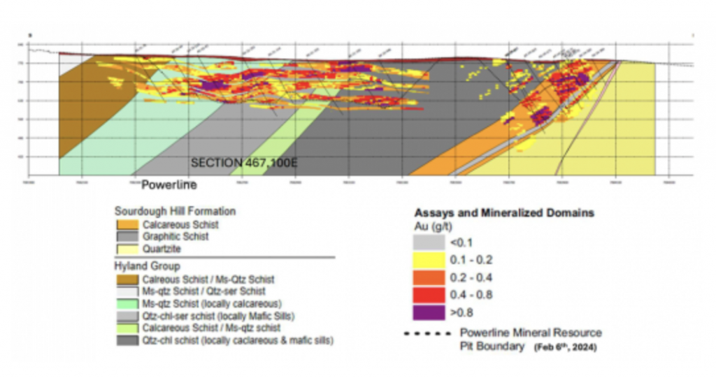 Within the Powerline Zone (south of Airstrip) and the more easterly Aurex Hill Zone, gold mineralization is hosted within sheeted quartz ± carbonate veins and lesser carbonate-replacement pyrrhotite-rich horizons similar to those in the Airstrip Zone. Principal ore minerals in the gold-bearing sheeted veins are arsenopyrite – pyrite – pyrrhotite – Bi-sulphosalts and visible gold which is commonly intergrown with Bi-sulphosalts. Structurally, sheeted vein orientations are consistent through both zones dipping shallowly to the north. Limestones and calcareous metasediments are less common than at Airstrip but have similar skarn-like replacement mineralization hosting semi-massive gold-bearing pyrrhotite horizons. Late-stage ‘Keno Hill style’ quartz and siderite veins with pyrite, galena, and sphalerite, which make up the principal economic deposits of the nearby Keno Hill area, also occur locally in the Powerline Zone.
